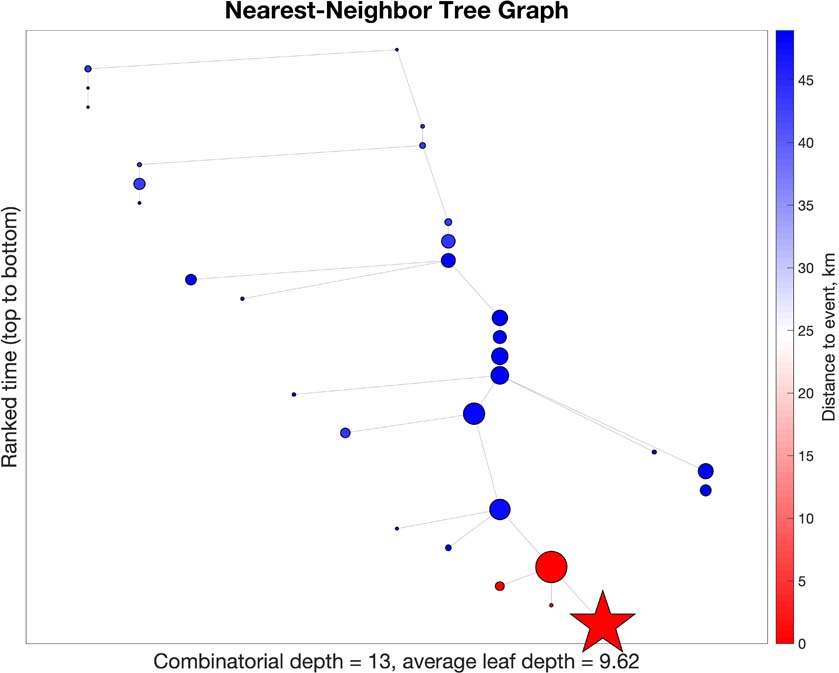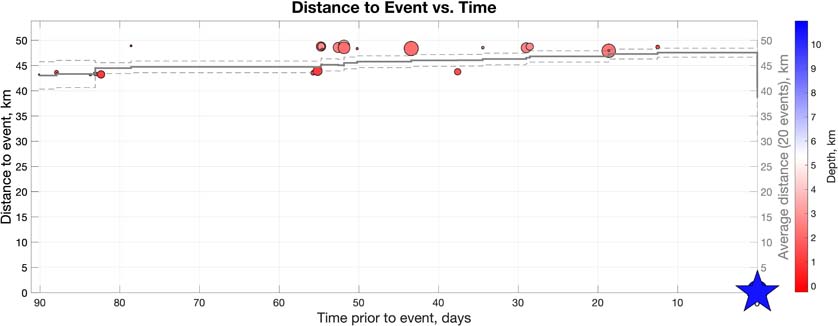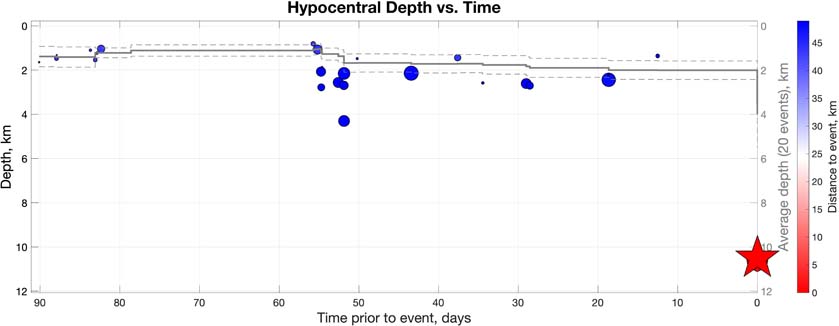This plot shows the magnitude vs. time evolution of the sequence. The mainshock is ploted as a brown circle, foreshocks are plotted as magenta circles, and aftershocks are plotted as cyan circles.