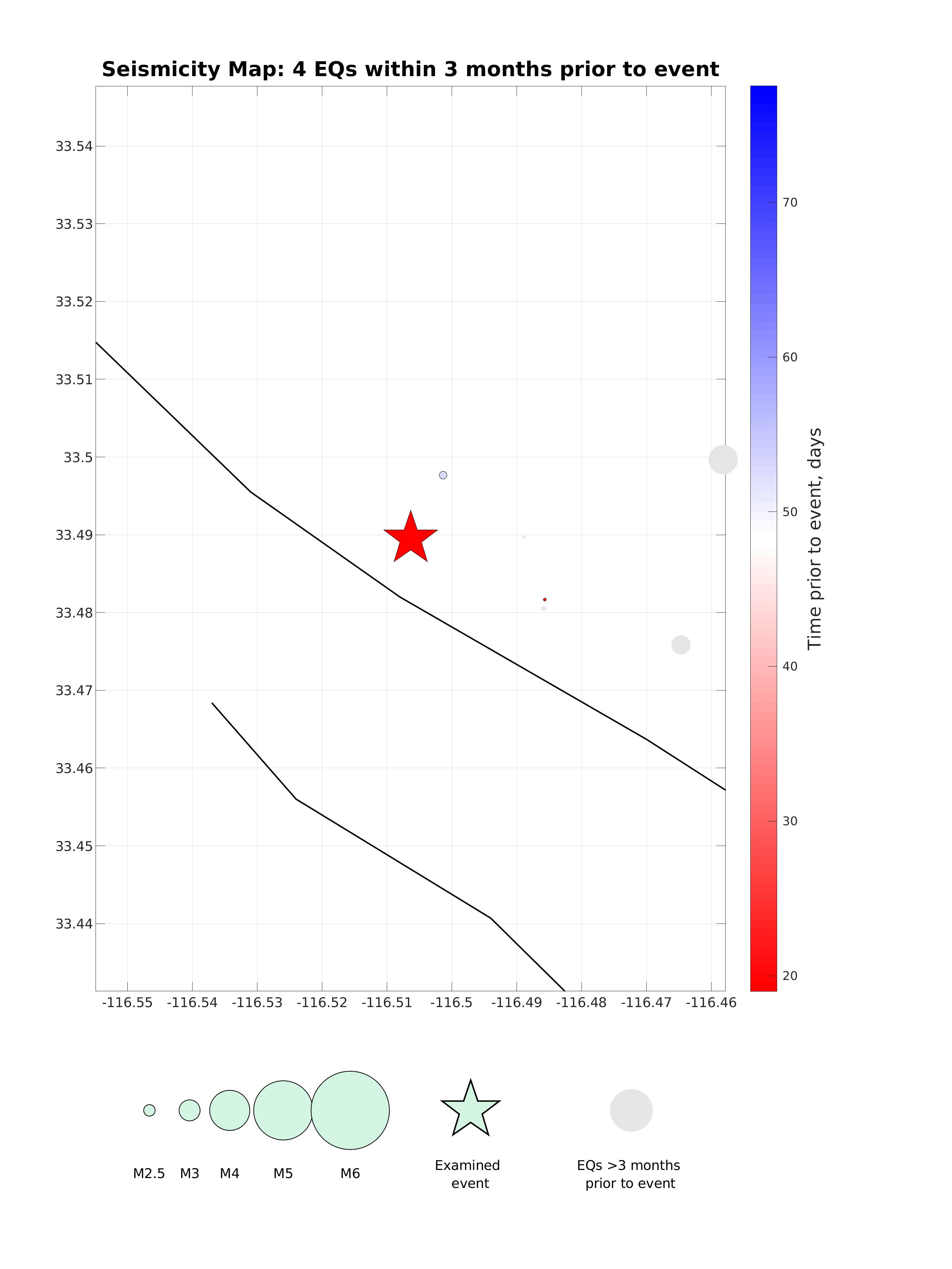 Map view of earthquakes (circles) with magnitude M2.0+ that occurred within 3 months and within 5 rupture lengths from the event considered (star). Circle size is proportional to magnitude (see legend) and color represents the time prior to the event considered (see colorbar).