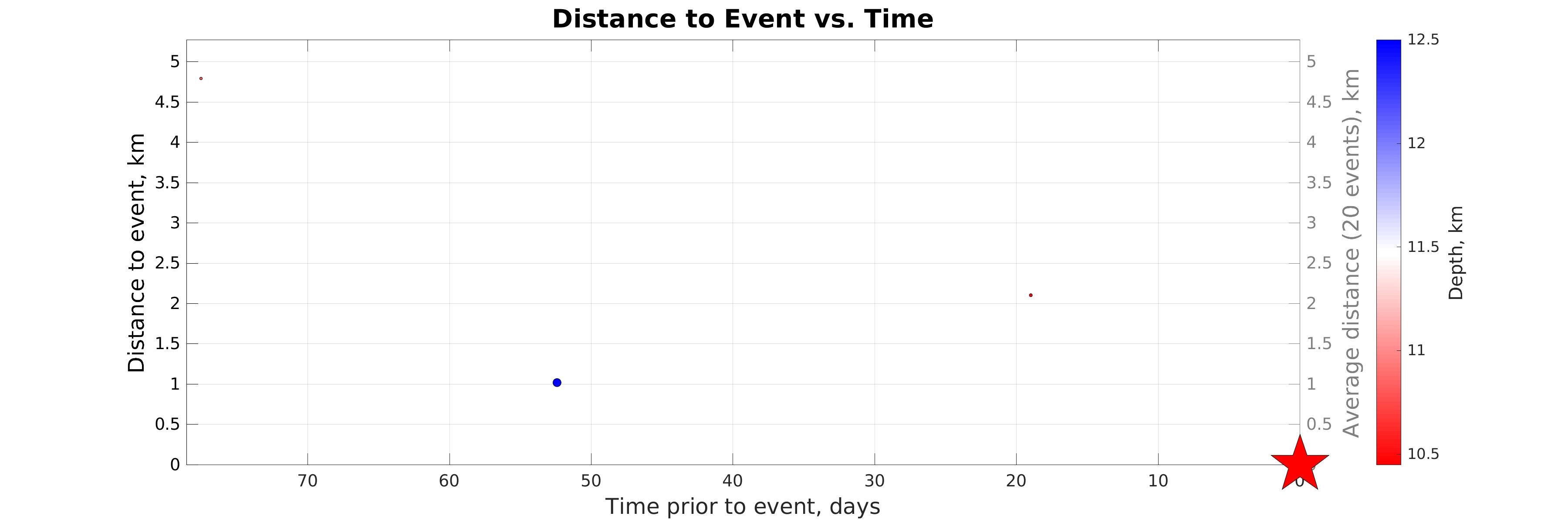 Distance (left axis) vs. time of earthquakes in the seismicity map prior to the event considered (star). Color represents hypocentral depth (see colorbar). The gray line shows distance to event considered averaged within sliding time window of 20 events.