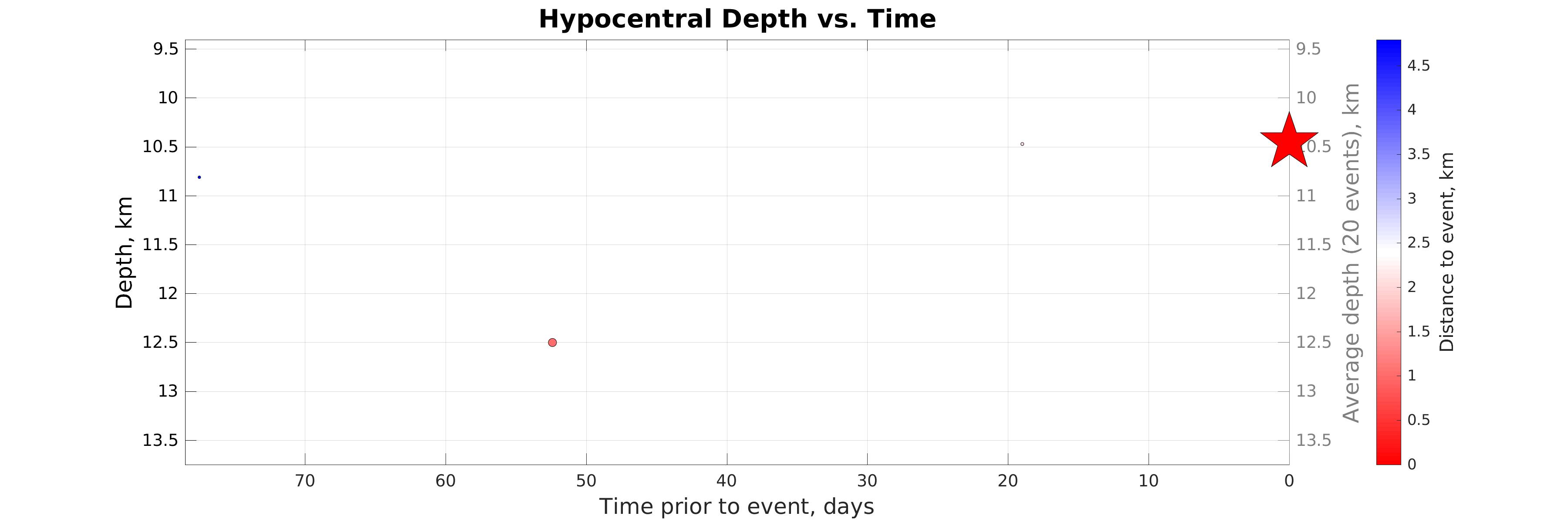 Hypocentral depth (left axis) vs. time of earthquakes in the seismicity map prior to the event considered (star). Color represents distance to the event considered (see colorbar). The gray line shows the depth averaged within sliding time window of 20 events.