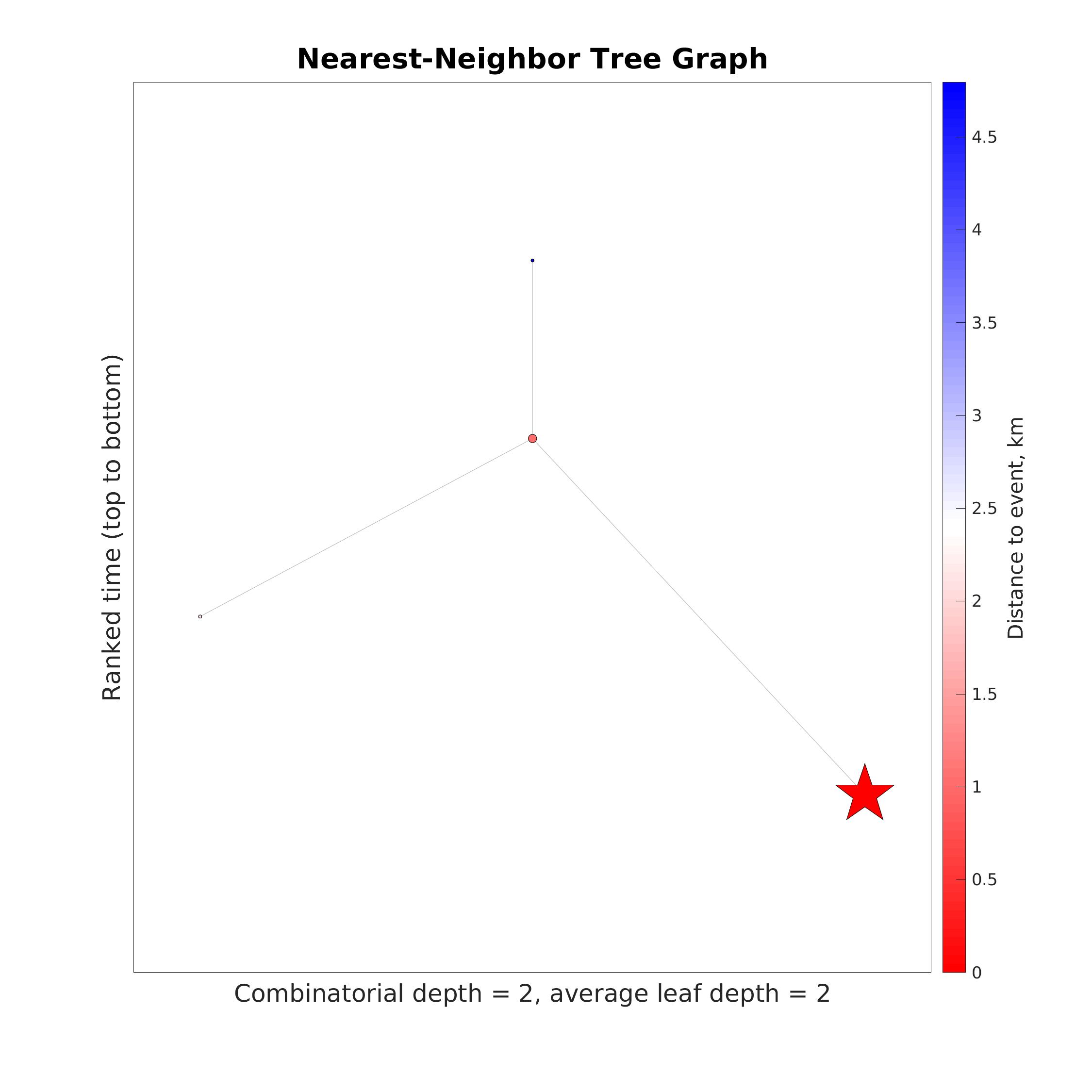 Tree graph representing nearest-neighbor connections (gray lines) among the earthquakes in the seismicity map prior to the event considered (star). Y-axis represents ranked time (from top to bottom). X-coordinates of events are calculated for proper visual embedding of the tree in the plane and do not represent a physical characteristic. Color represents distance to the event considered (see colorbar). The combinatorial depth of the tree (number of generations) and the average leaf depth are marked. The results are based on the methodology of Zaliapin and Ben-Zion (2013).
