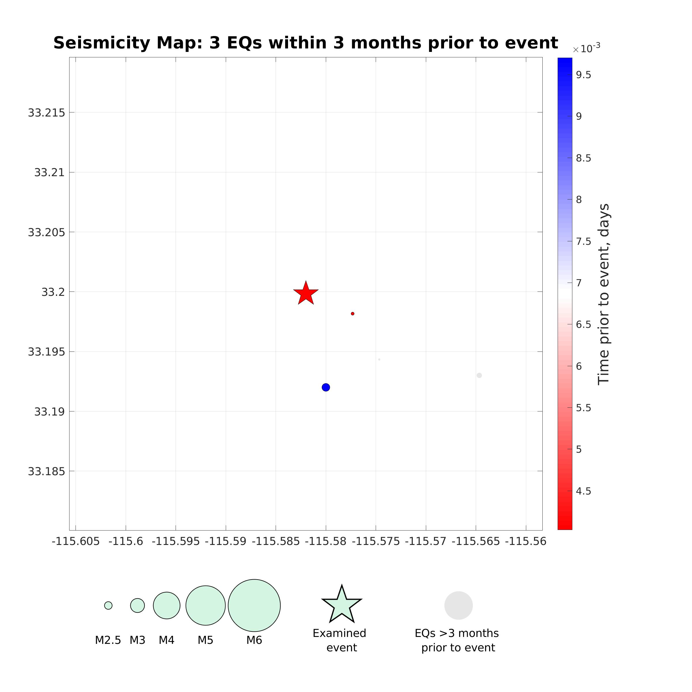 Map view of earthquakes (circles) with magnitude M2.0+ that occurred within 3 months and within 5 rupture lengths from the event considered (star). Circle size is proportional to magnitude (see legend) and color represents the time prior to the event considered (see colorbar).