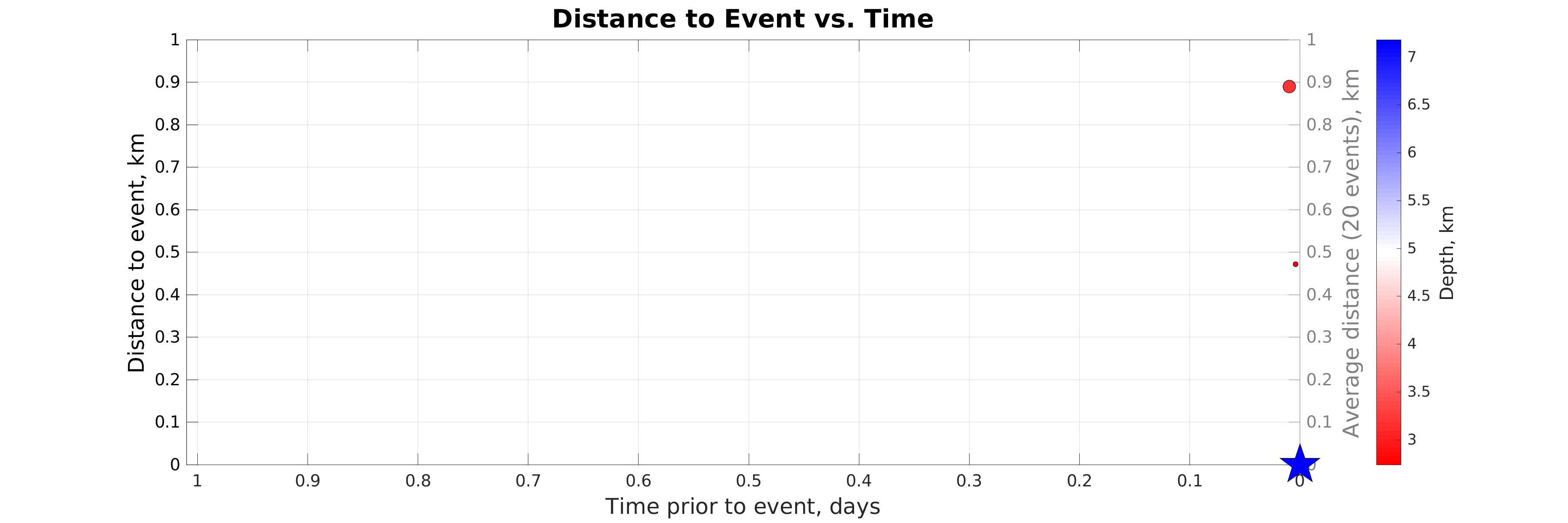 Distance (left axis) vs. time of earthquakes in the seismicity map prior to the event considered (star). Color represents hypocentral depth (see colorbar). The gray line shows distance to event considered averaged within sliding time window of 20 events.
