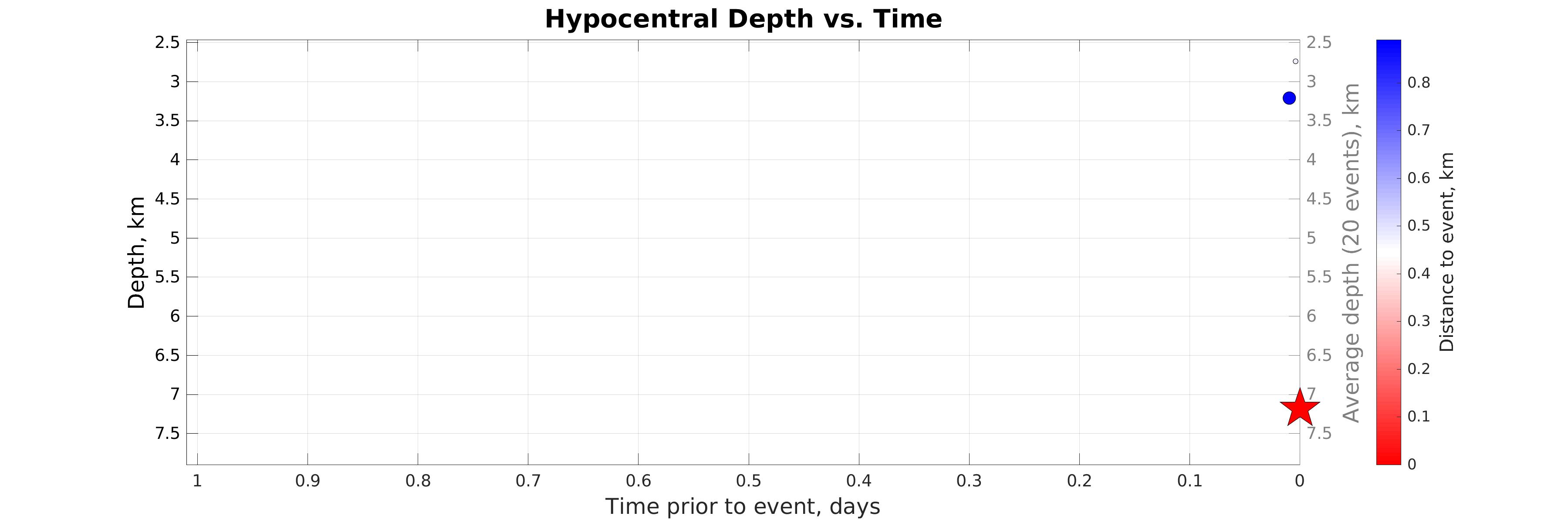 Hypocentral depth (left axis) vs. time of earthquakes in the seismicity map prior to the event considered (star). Color represents distance to the event considered (see colorbar). The gray line shows the depth averaged within sliding time window of 20 events.