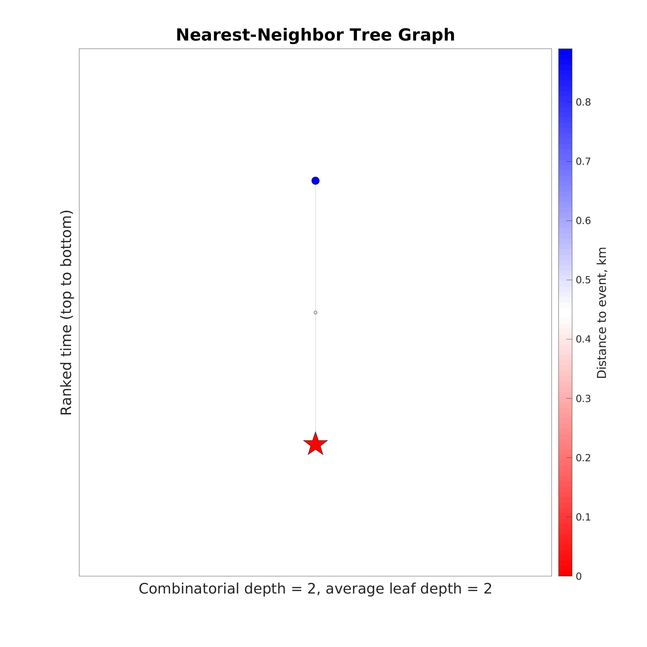 Tree graph representing nearest-neighbor connections (gray lines) among the earthquakes in the seismicity map prior to the event considered (star). Y-axis represents ranked time (from top to bottom). X-coordinates of events are calculated for proper visual embedding of the tree in the plane and do not represent a physical characteristic. Color represents distance to the event considered (see colorbar). The combinatorial depth of the tree (number of generations) and the average leaf depth are marked. The results are based on the methodology of Zaliapin and Ben-Zion (2013).