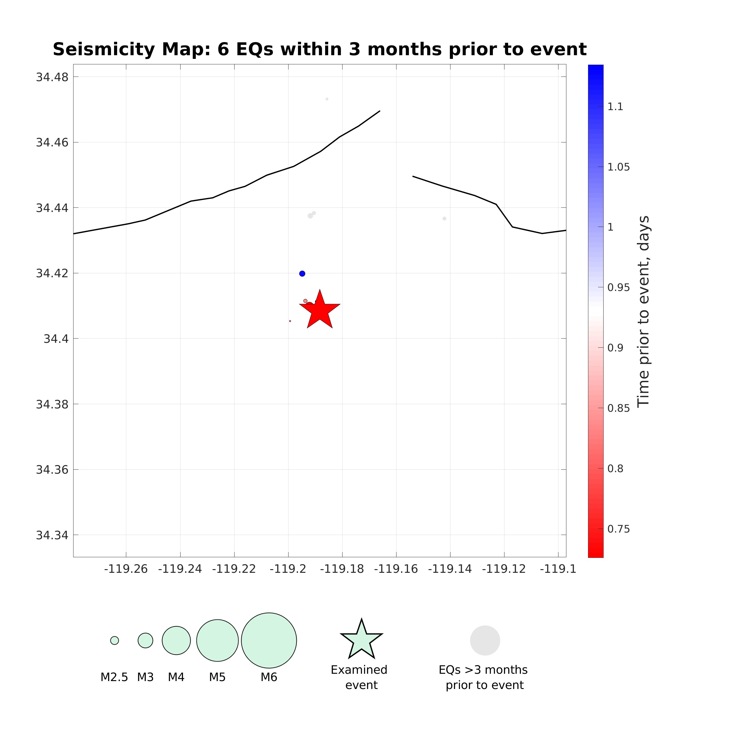 Map view of earthquakes (circles) with magnitude M2.0+ that occurred within 3 months and within 5 rupture lengths from the event considered (star). Circle size is proportional to magnitude (see legend) and color represents the time prior to the event considered (see colorbar).