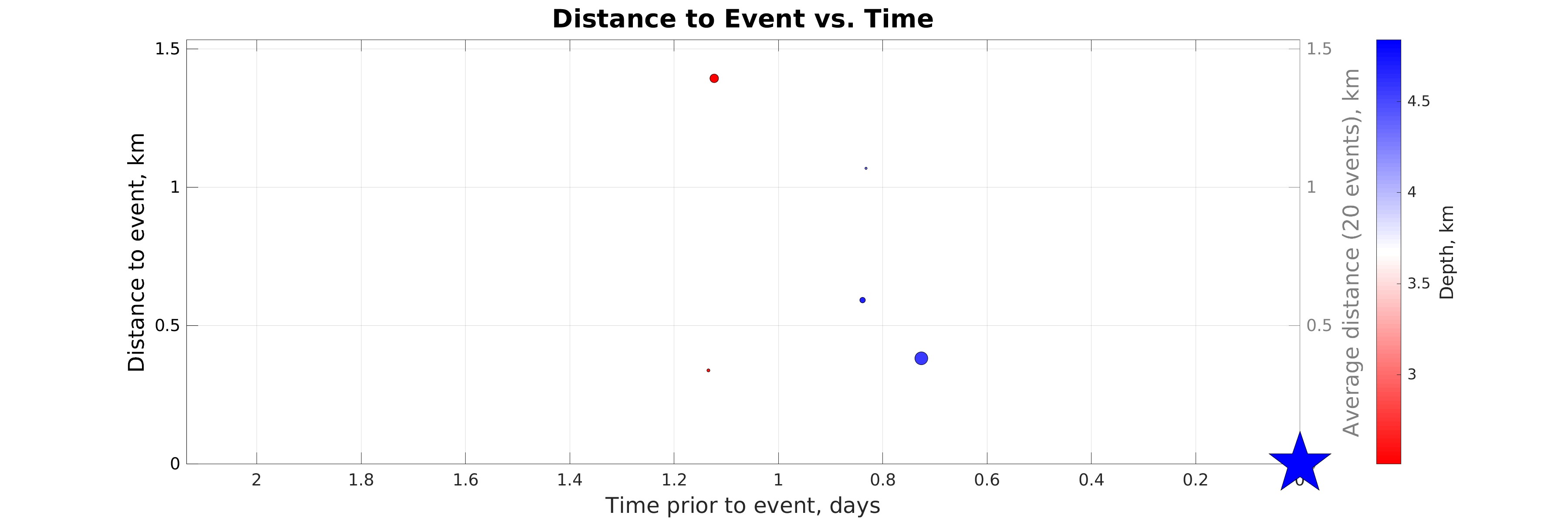 Distance (left axis) vs. time of earthquakes in the seismicity map prior to the event considered (star). Color represents hypocentral depth (see colorbar). The gray line shows distance to event considered averaged within sliding time window of 20 events.