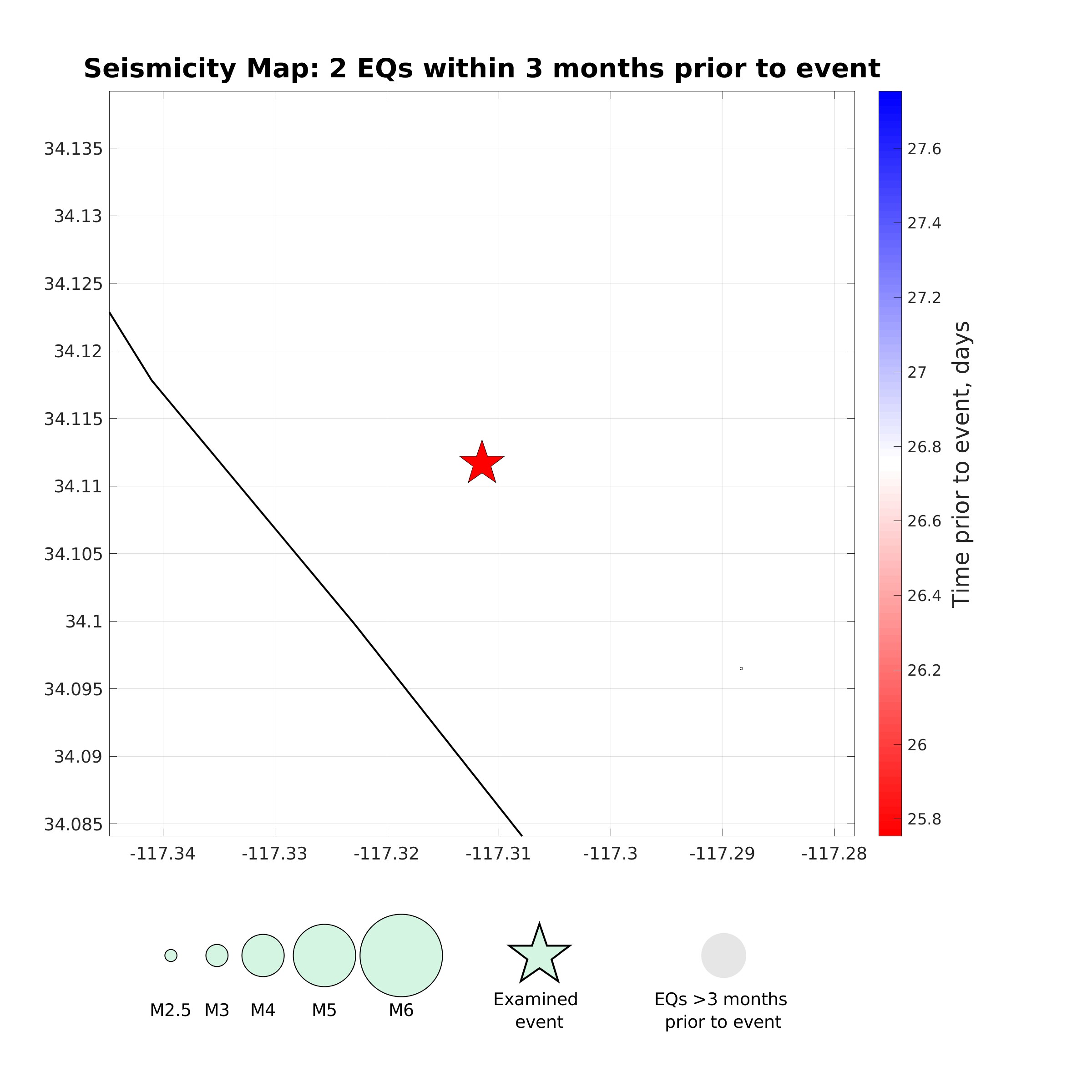 Map view of earthquakes (circles) with magnitude M2.0+ that occurred within 3 months and within 5 rupture lengths from the event considered (star). Circle size is proportional to magnitude (see legend) and color represents the time prior to the event considered (see colorbar).