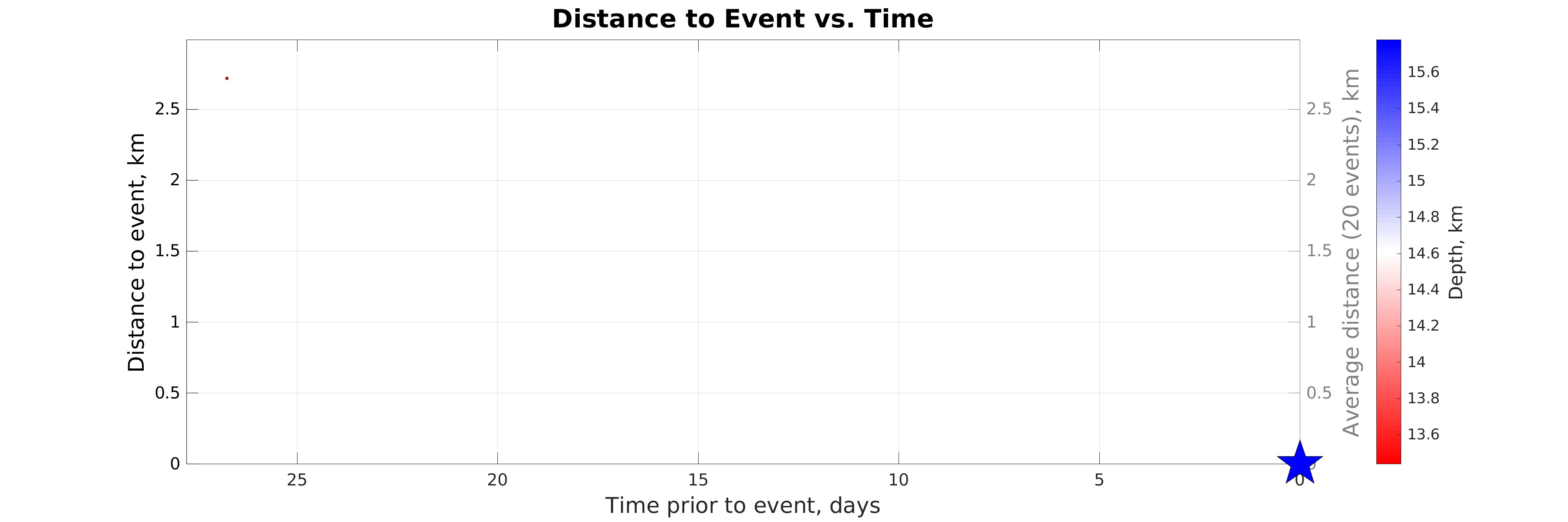 Distance (left axis) vs. time of earthquakes in the seismicity map prior to the event considered (star). Color represents hypocentral depth (see colorbar). The gray line shows distance to event considered averaged within sliding time window of 20 events.