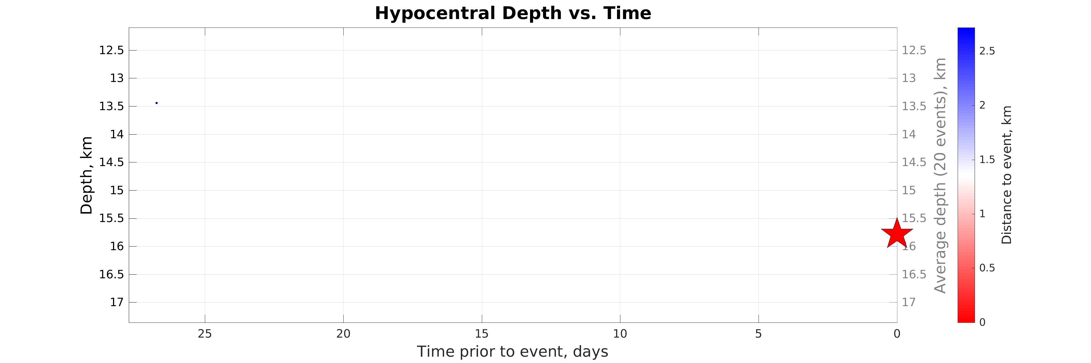 Hypocentral depth (left axis) vs. time of earthquakes in the seismicity map prior to the event considered (star). Color represents distance to the event considered (see colorbar). The gray line shows the depth averaged within sliding time window of 20 events.