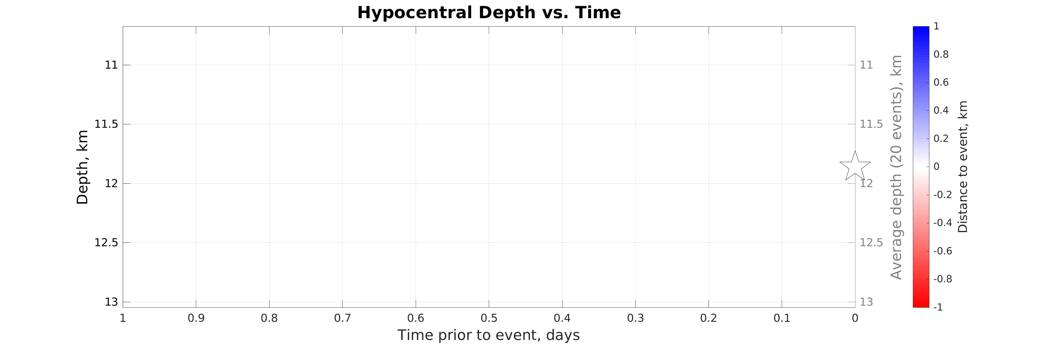 Hypocentral depth (left axis) vs. time of earthquakes in the seismicity map prior to the event considered (star). Color represents distance to the event considered (see colorbar). The gray line shows the depth averaged within sliding time window of 20 events.