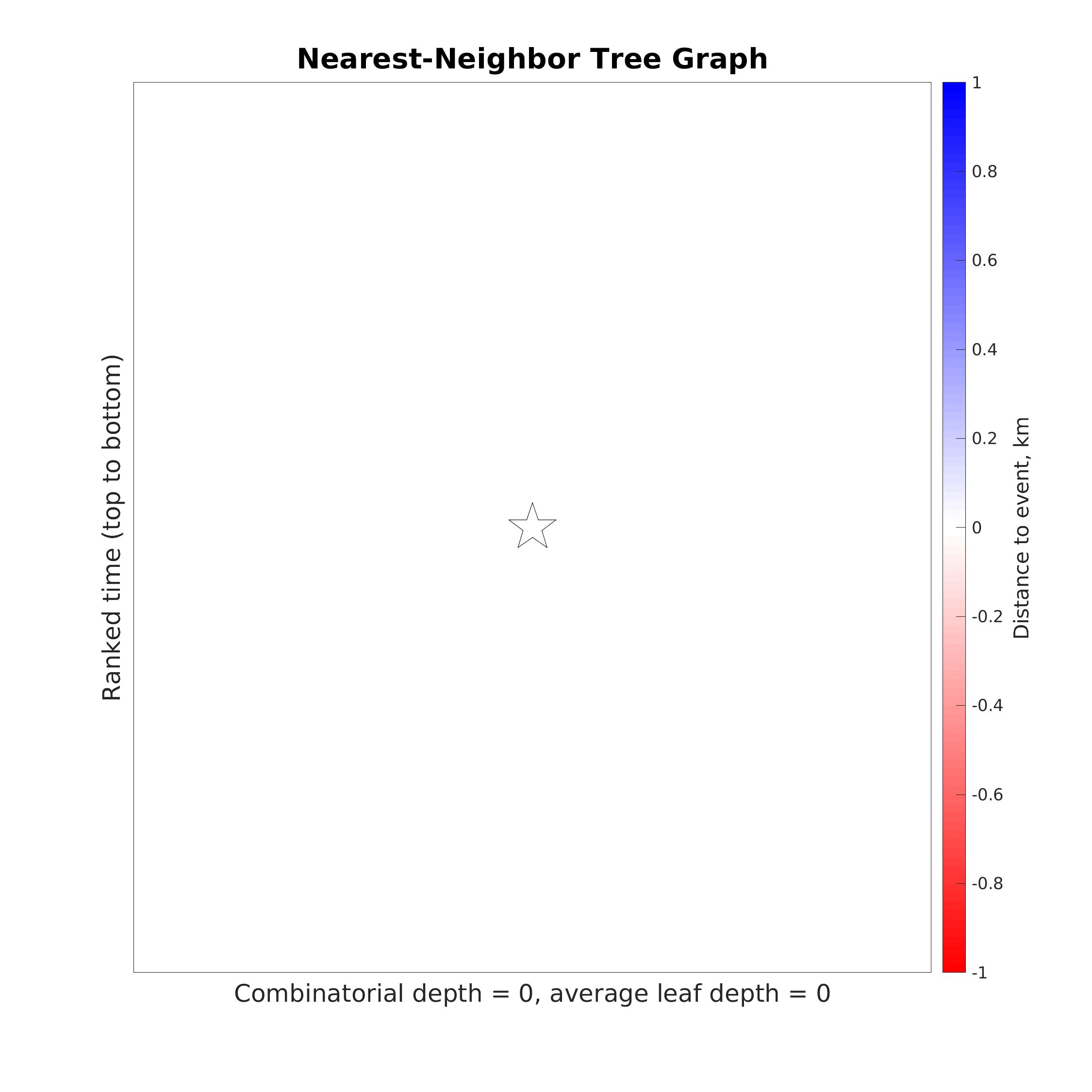 Tree graph representing nearest-neighbor connections (gray lines) among the earthquakes in the seismicity map prior to the event considered (star). Y-axis represents ranked time (from top to bottom). X-coordinates of events are calculated for proper visual embedding of the tree in the plane and do not represent a physical characteristic. Color represents distance to the event considered (see colorbar). The combinatorial depth of the tree (number of generations) and the average leaf depth are marked. The results are based on the methodology of Zaliapin and Ben-Zion (2013).