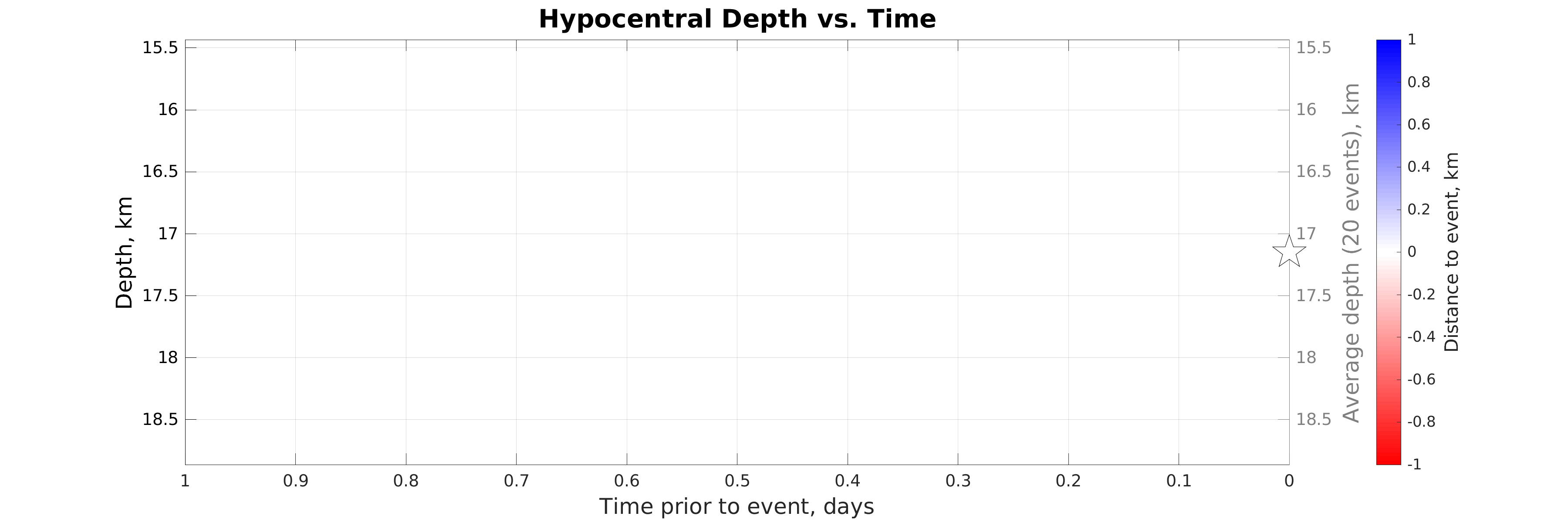 Hypocentral depth (left axis) vs. time of earthquakes in the seismicity map prior to the event considered (star). Color represents distance to the event considered (see colorbar). The gray line shows the depth averaged within sliding time window of 20 events.