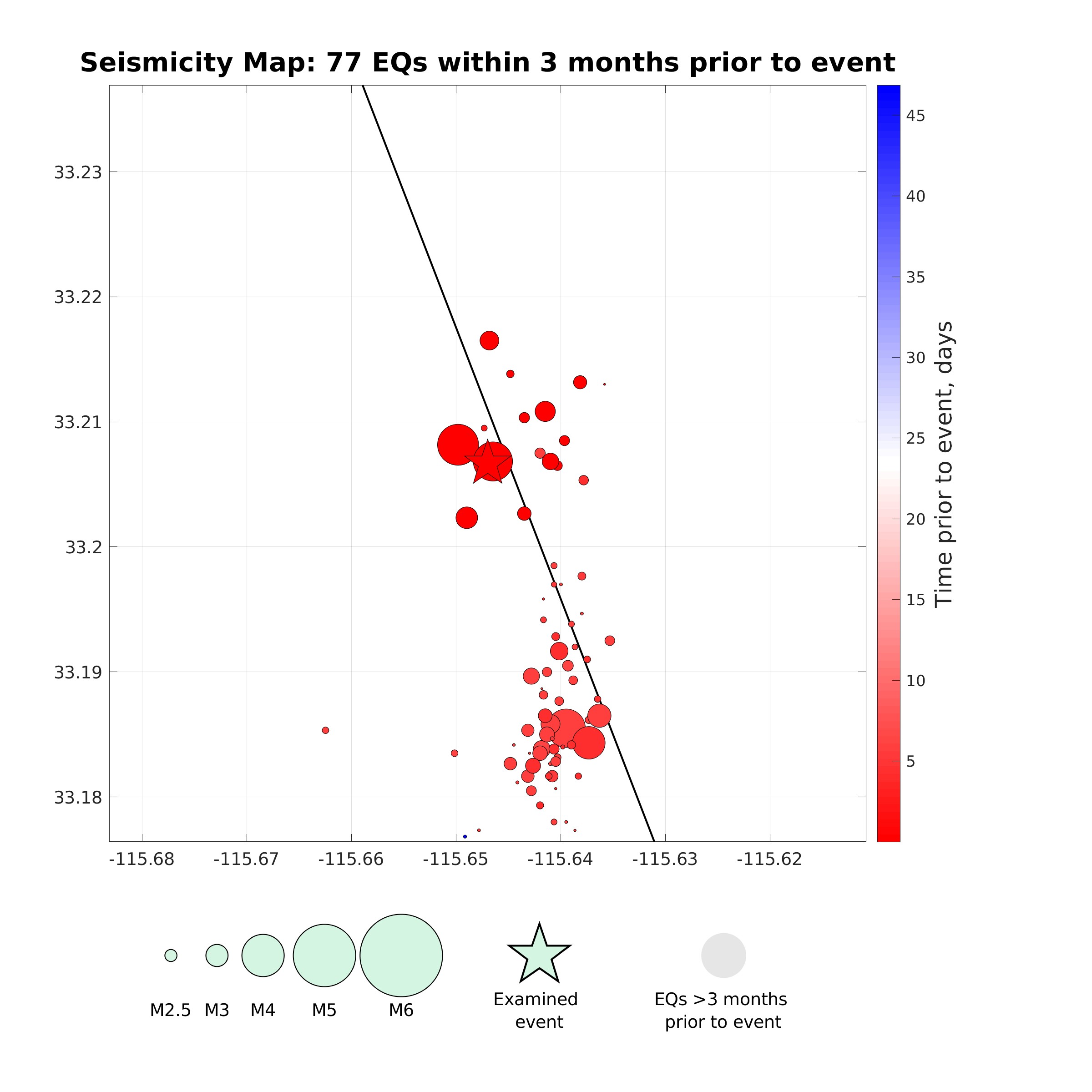 This plot shows the magnitude vs. time evolution of the sequence. The mainshock is ploted as a brown circle, foreshocks are plotted as magenta circles, and aftershocks are plotted as cyan circles.