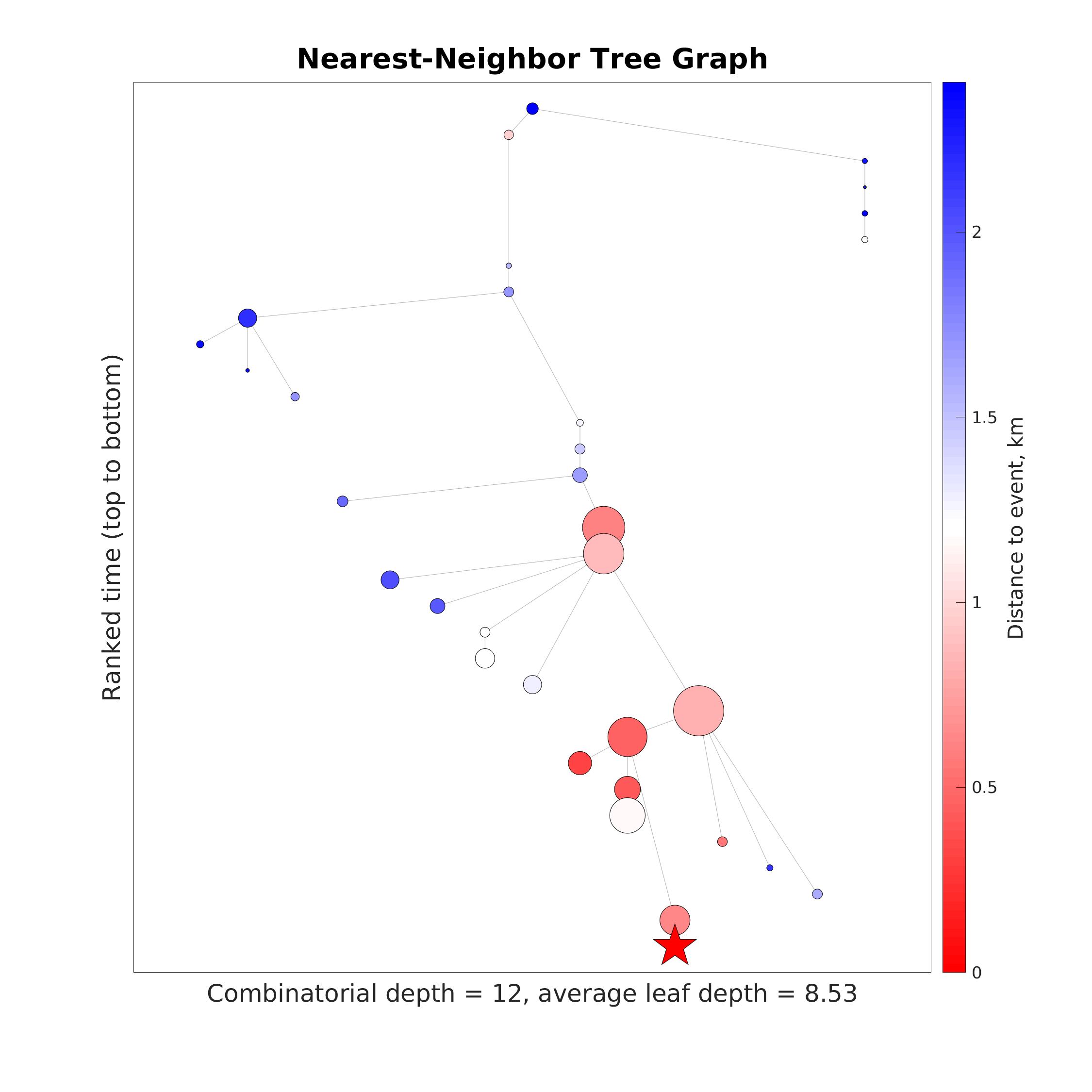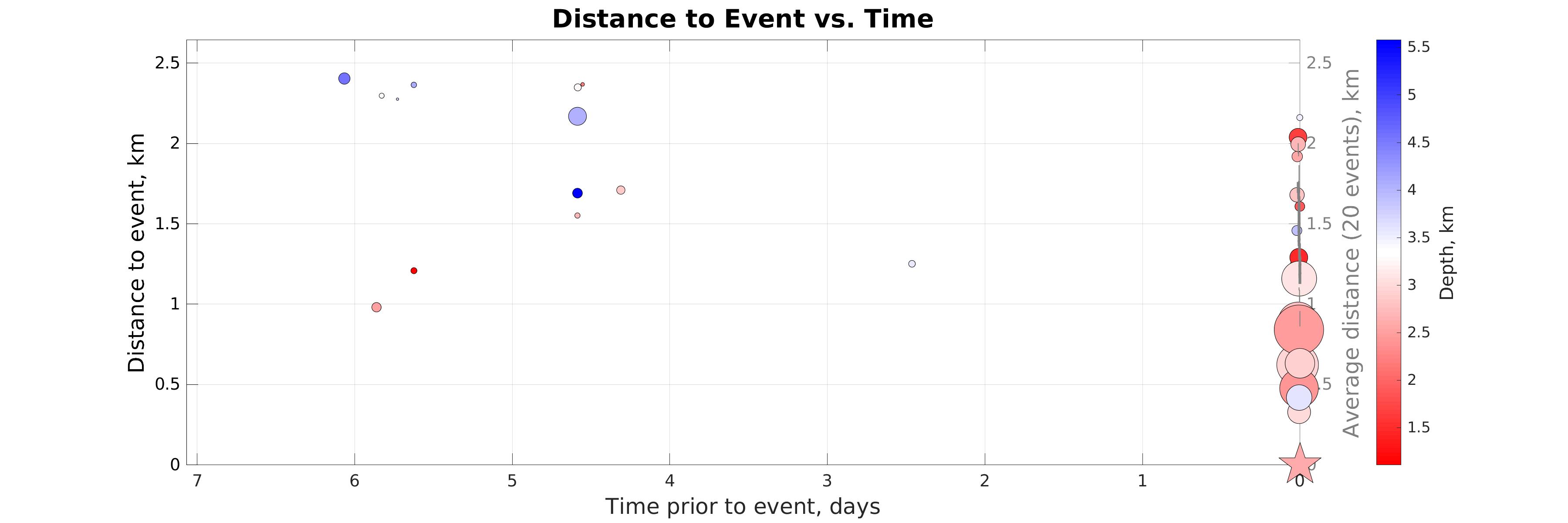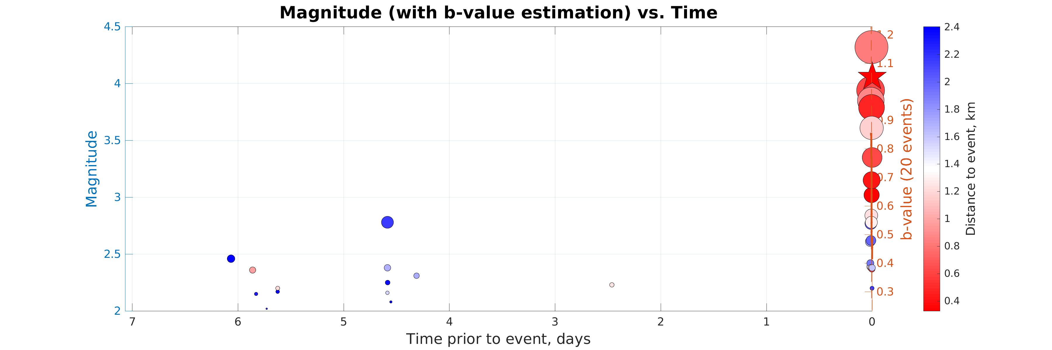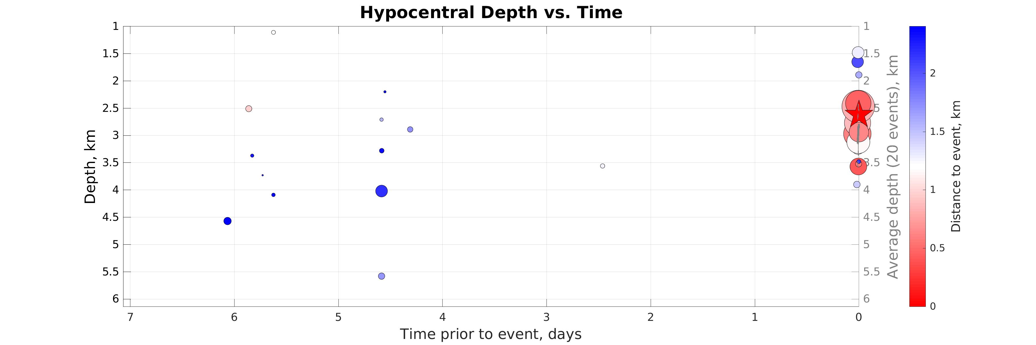 This plot shows the magnitude vs. time evolution of the sequence. The mainshock is ploted as a brown circle, foreshocks are plotted as magenta circles, and aftershocks are plotted as cyan circles.