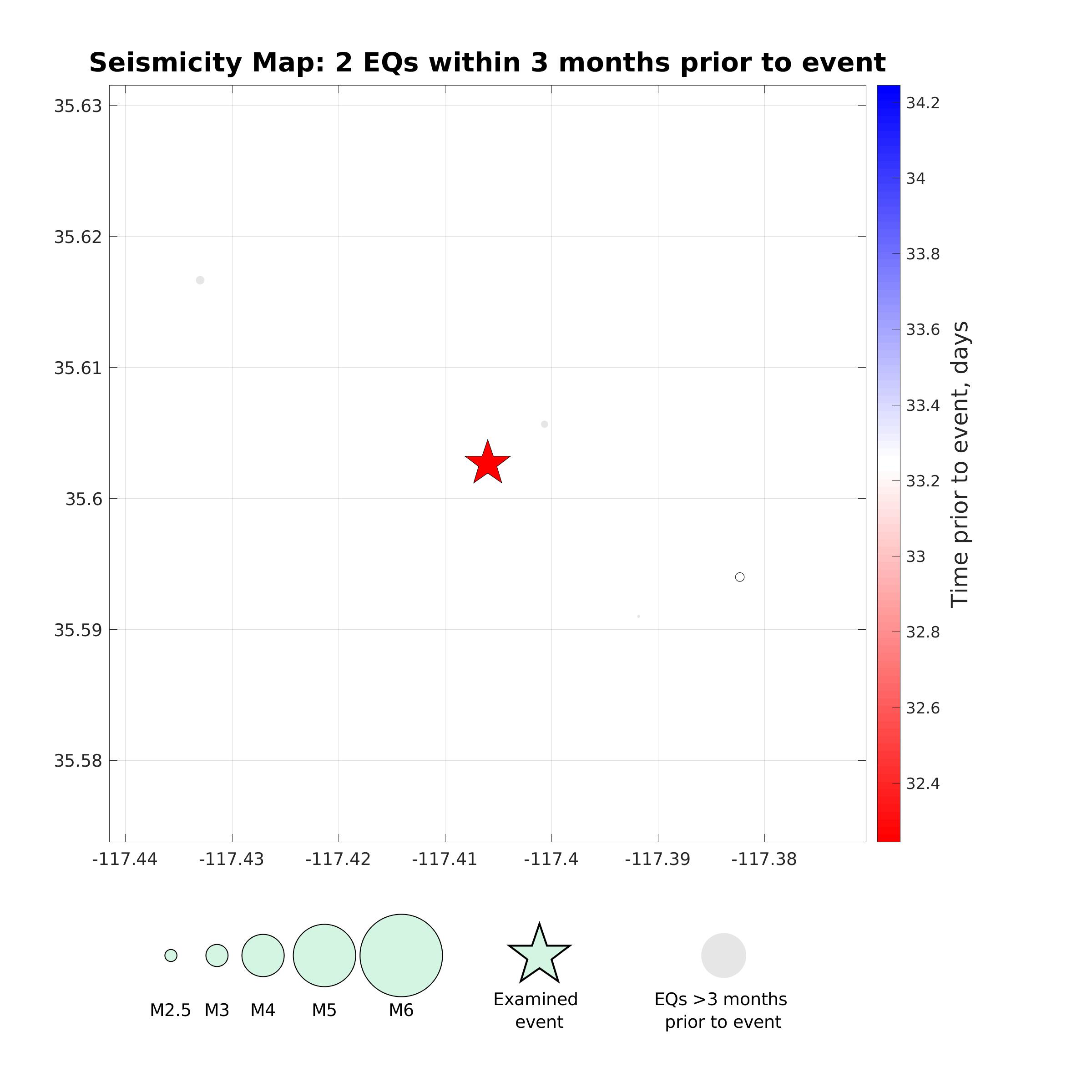 Map view of earthquakes (circles) with magnitude M2.0+ that occurred within 3 months and within 5 rupture lengths from the event considered (star). Circle size is proportional to magnitude (see legend) and color represents the time prior to the event considered (see colorbar).