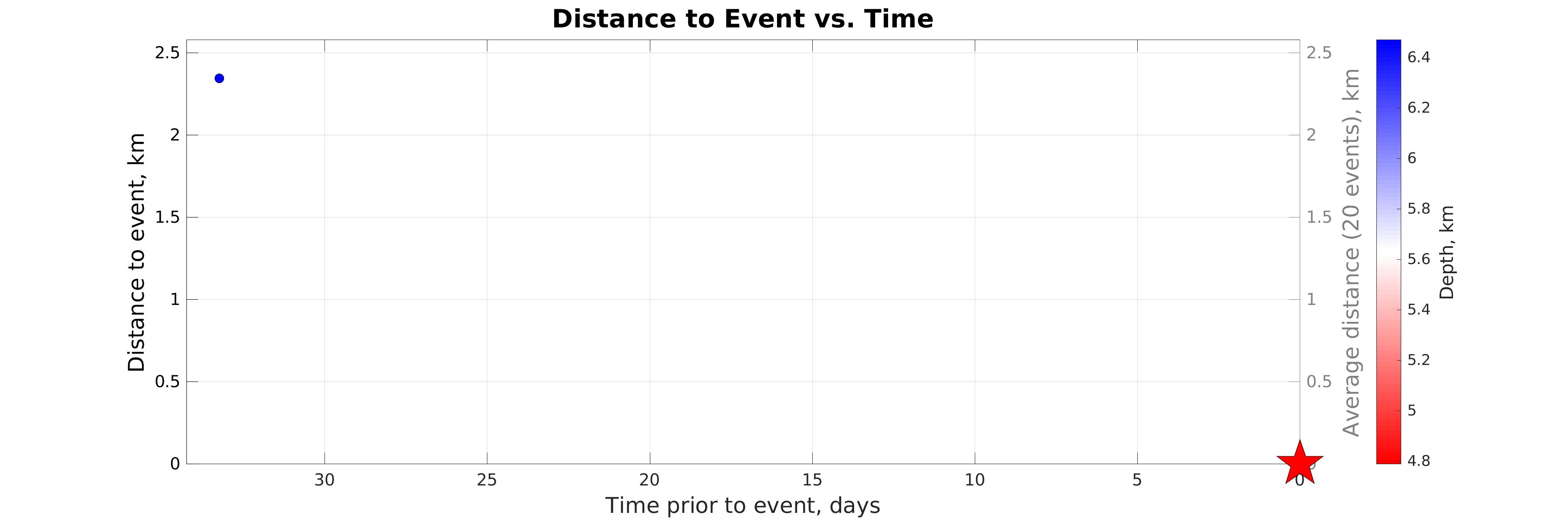 Distance (left axis) vs. time of earthquakes in the seismicity map prior to the event considered (star). Color represents hypocentral depth (see colorbar). The gray line shows distance to event considered averaged within sliding time window of 20 events.