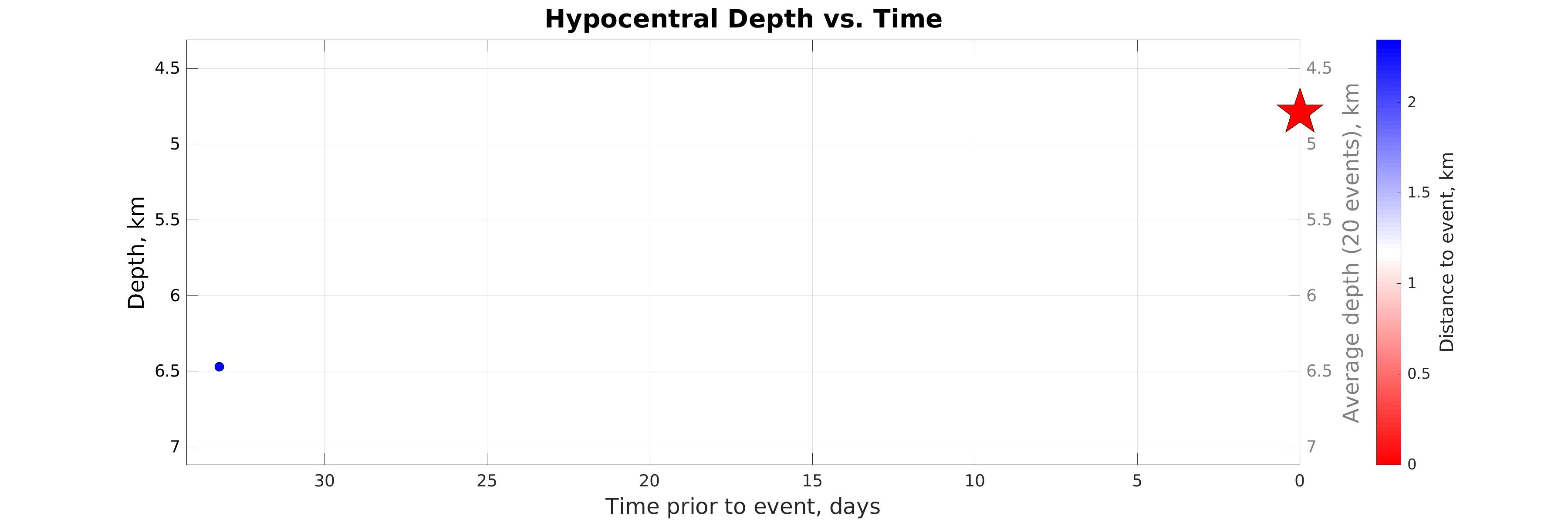 Hypocentral depth (left axis) vs. time of earthquakes in the seismicity map prior to the event considered (star). Color represents distance to the event considered (see colorbar). The gray line shows the depth averaged within sliding time window of 20 events.