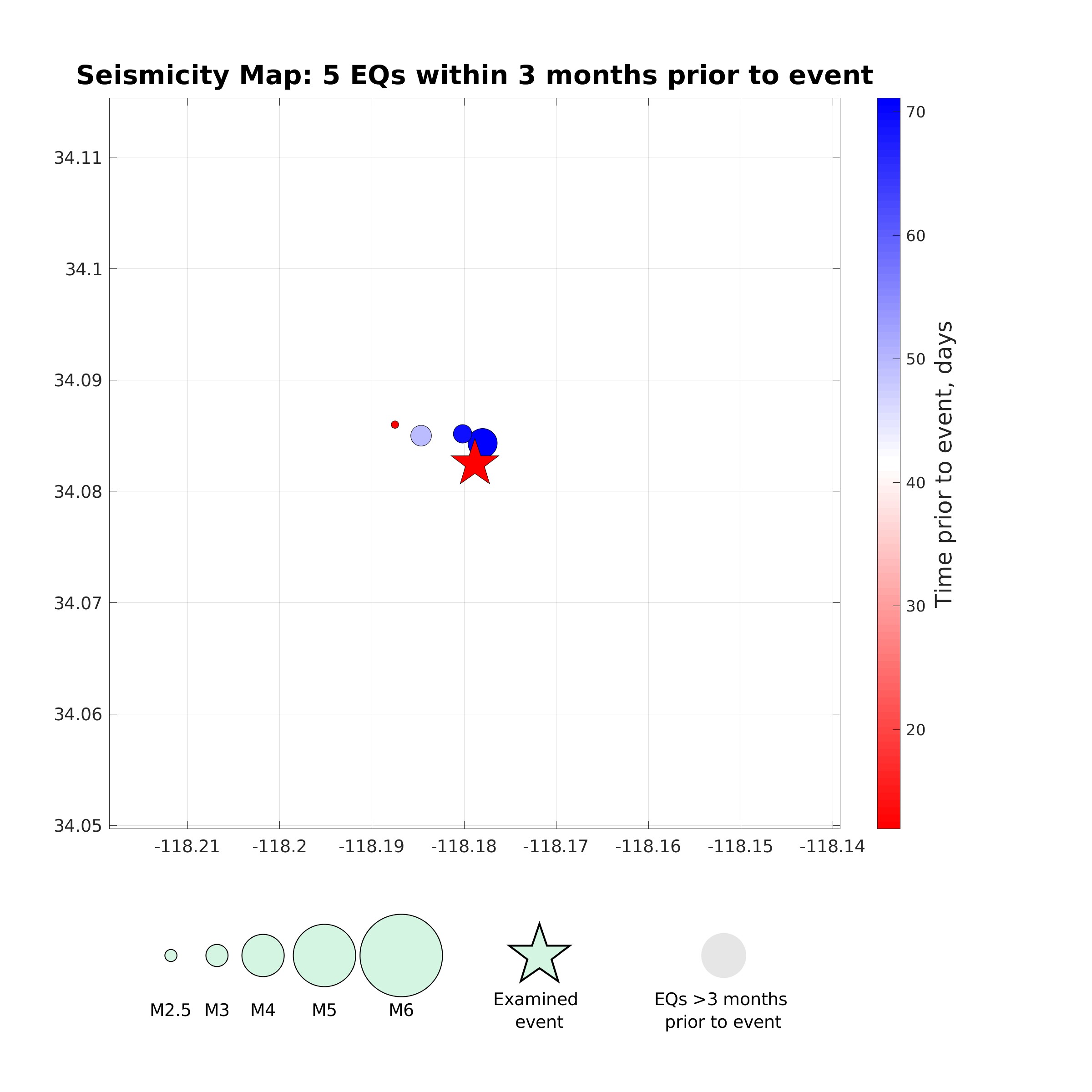 Map view of earthquakes (circles) with magnitude M2.0+ that occurred within 3 months and within 5 rupture lengths from the event considered (star). Circle size is proportional to magnitude (see legend) and color represents the time prior to the event considered (see colorbar).