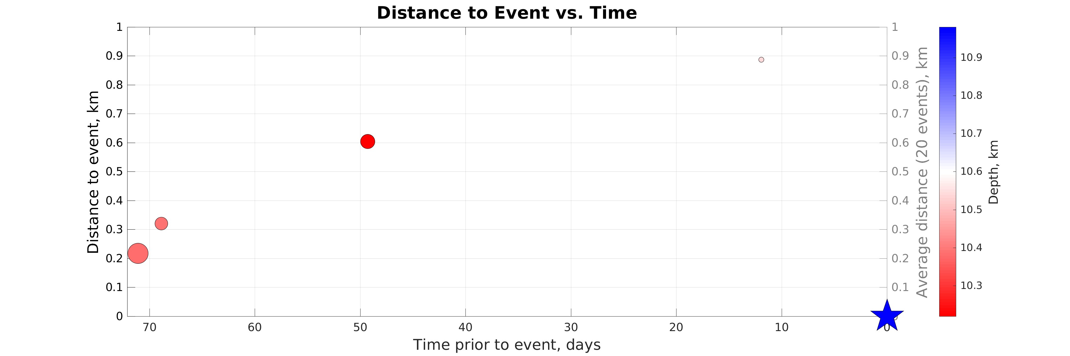 Distance (left axis) vs. time of earthquakes in the seismicity map prior to the event considered (star). Color represents hypocentral depth (see colorbar). The gray line shows distance to event considered averaged within sliding time window of 20 events.