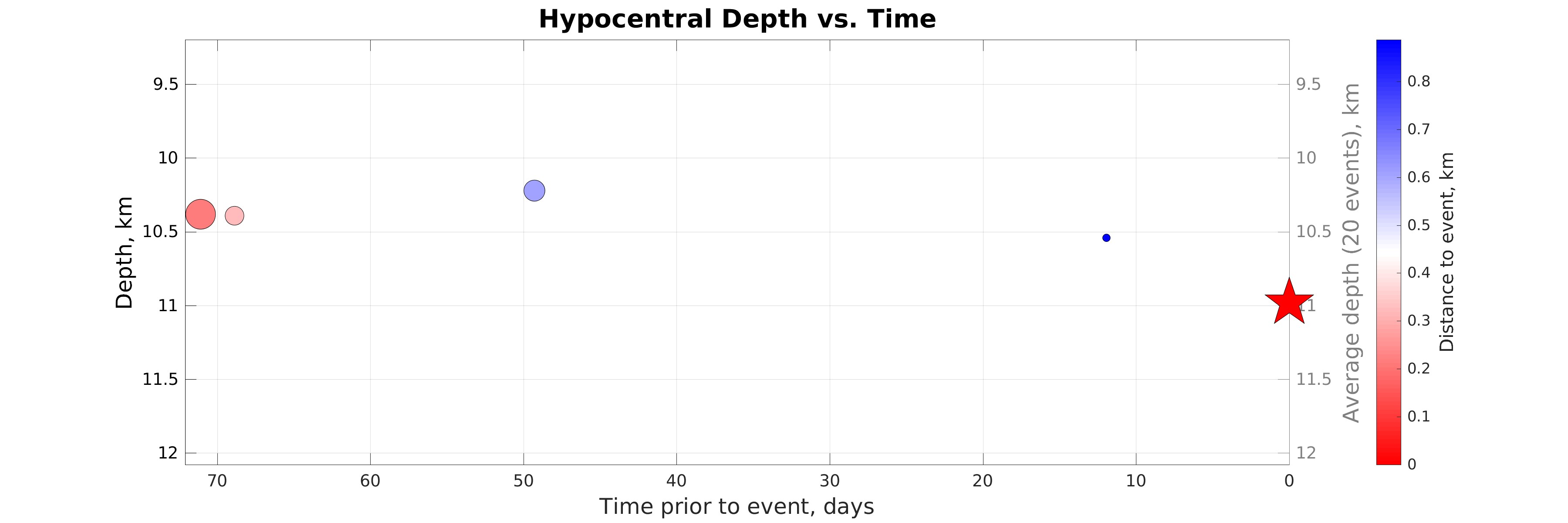 Hypocentral depth (left axis) vs. time of earthquakes in the seismicity map prior to the event considered (star). Color represents distance to the event considered (see colorbar). The gray line shows the depth averaged within sliding time window of 20 events.