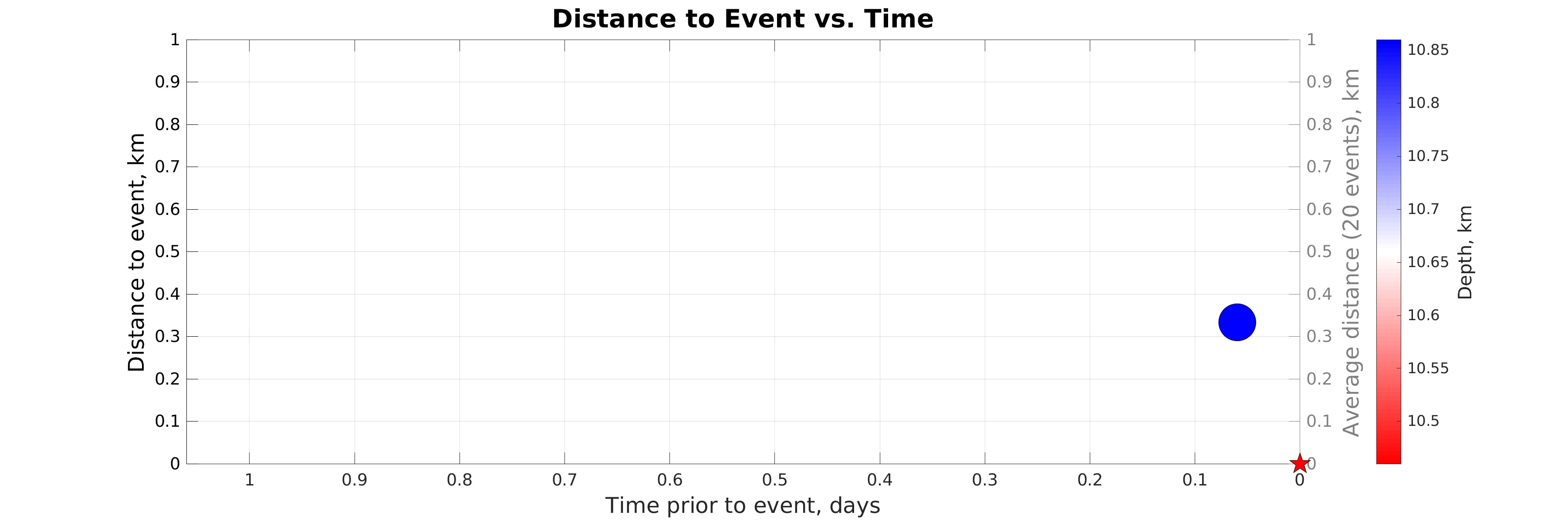 Distance (left axis) vs. time of earthquakes in the seismicity map prior to the event considered (star). Color represents hypocentral depth (see colorbar). The gray line shows distance to event considered averaged within sliding time window of 20 events.