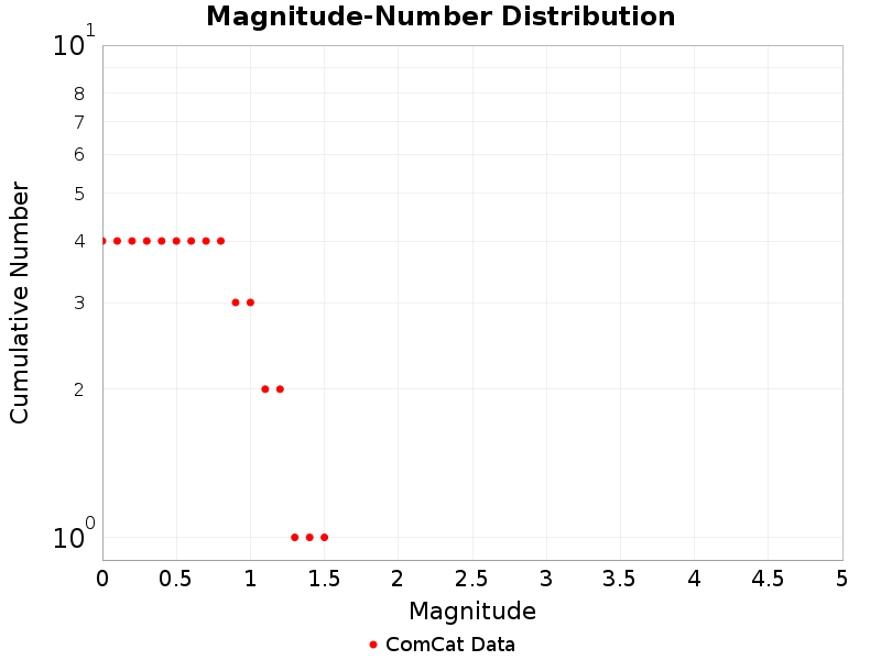 These plot shows the magnitude-number distribution of the aftershock sequence thus far. The left plot gives an incremental distribution (the count in each magnitude bin), and the right plot a cumulative distribution (the count in or above each magnitude bin).