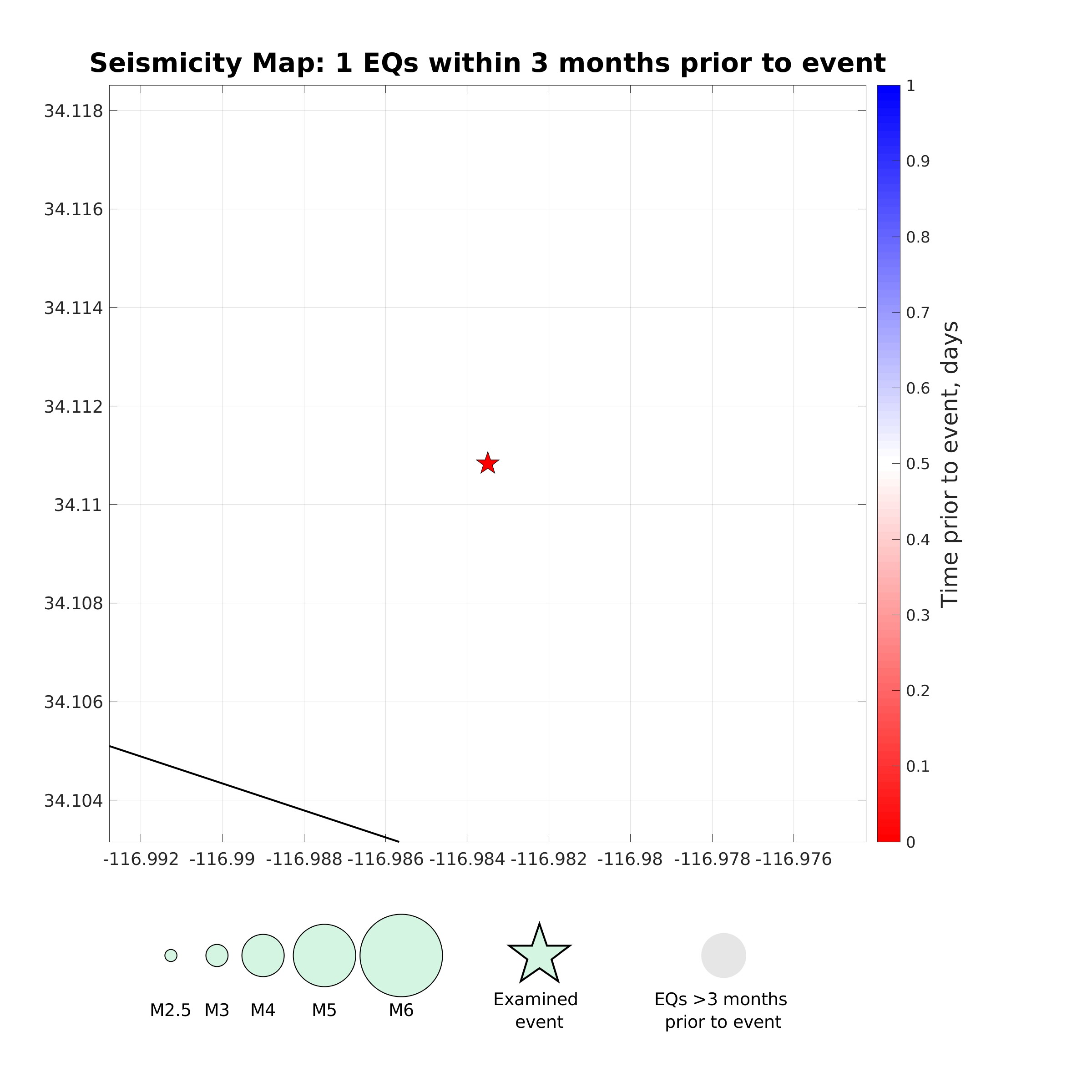 Map view of earthquakes (circles) with magnitude M2.0+ that occurred within 3 months and within 5 rupture lengths from the event considered (star). Circle size is proportional to magnitude (see legend) and color represents the time prior to the event considered (see colorbar).