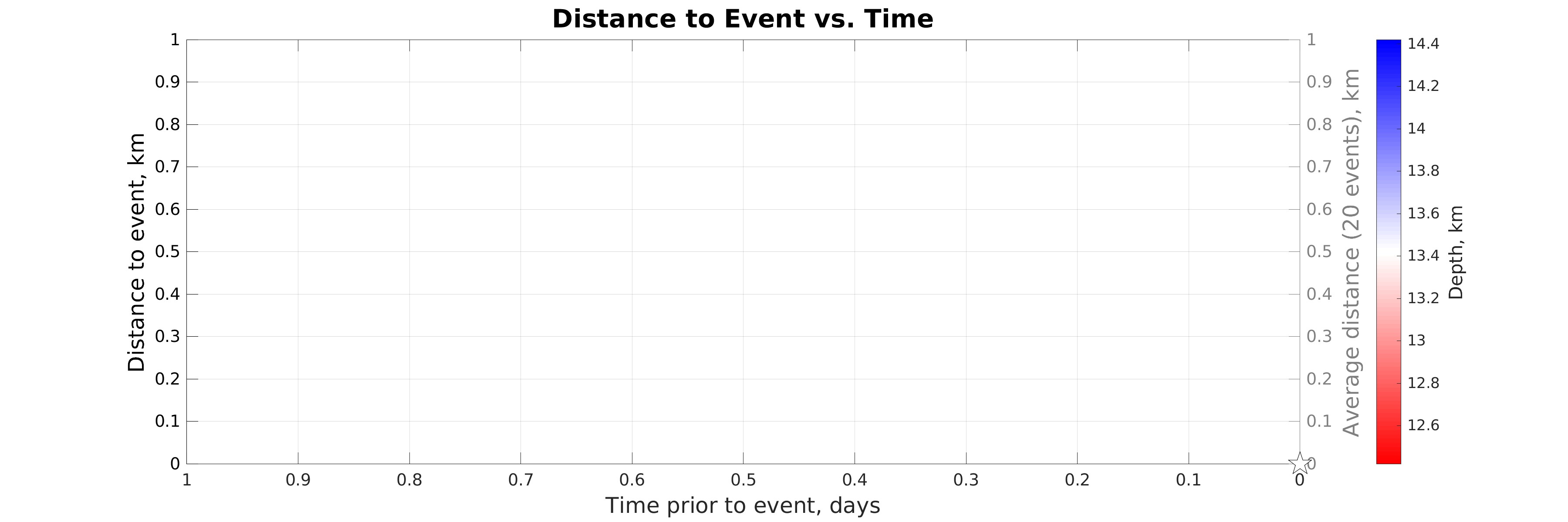 Distance (left axis) vs. time of earthquakes in the seismicity map prior to the event considered (star). Color represents hypocentral depth (see colorbar). The gray line shows distance to event considered averaged within sliding time window of 20 events.