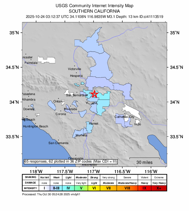 Probabilities are inherantly time-dependent. Those stated here are for time periods beginning the instant when this report was generated, 2025/11/04 21:59:52 PST. The model has not been updated with any observed aftershocks and may be out of date, especially if large aftershock have occurred subsequently or a significant amount of time has passed since the mainshock.
