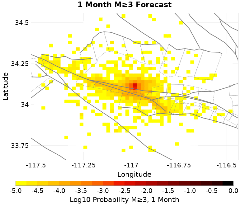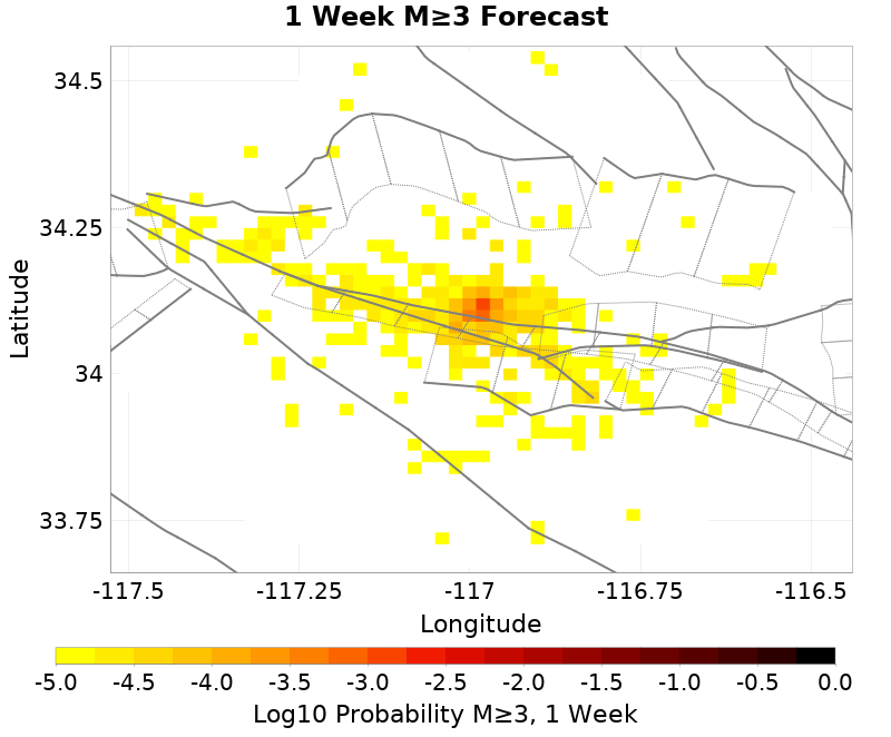 This section gives results from the UCERF3-ETAS short-term forecasting model. This model is described in Field et al. (2017), and computes probabilities of this sequence triggering subsequent aftershocks, including events on known faults.