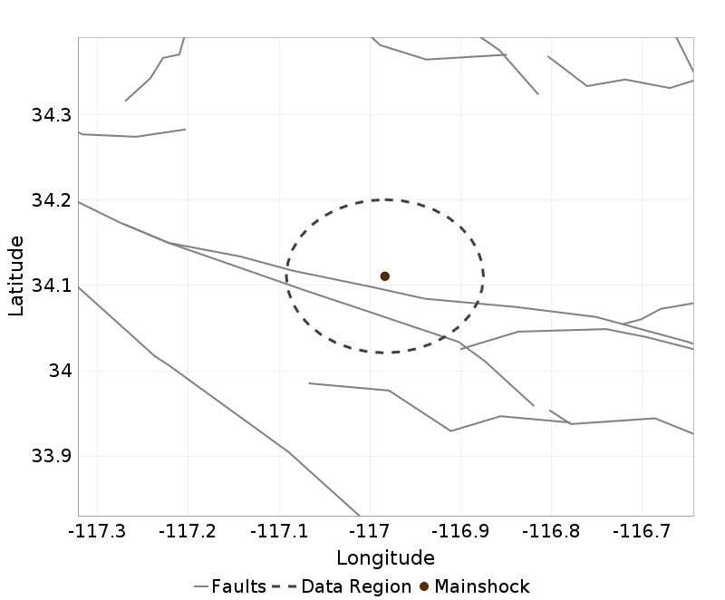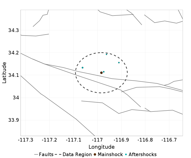 Map view of the aftershock sequence, plotted as cyan circles. The mainshock is plotted below as a brown circle, but may be obscured by aftershocks. Nearby UCERF3 fault traces are plotted in gray lines, and the region used to fetch aftershock data in a dashed dark gray line.