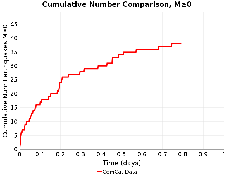 This plot shows the cumulative number of M≥0 aftershocks as a function of time since the mainshock.