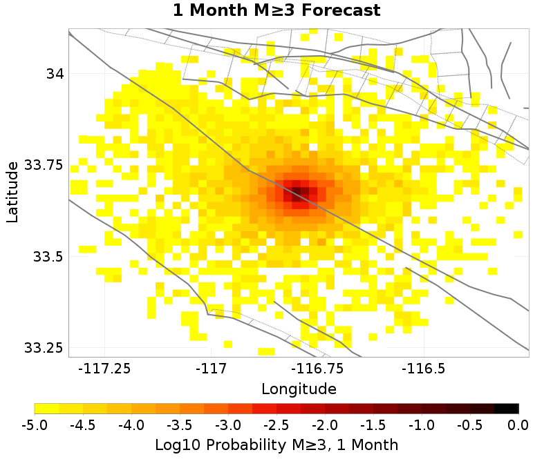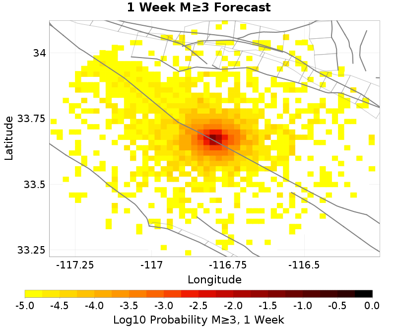 This section gives results from the UCERF3-ETAS short-term forecasting model. This model is described in Field et al. (2017), and computes probabilities of this sequence triggering subsequent aftershocks, including events on known faults.