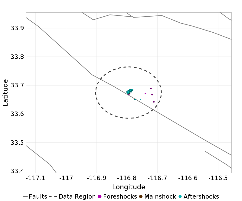 Map view of the aftershock sequence, plotted as cyan circles. The mainshock and foreshocks are plotted below in brown and magenta circles respectively, but may be obscured by aftershocks. Nearby UCERF3 fault traces are plotted in gray lines, and the region used to fetch aftershock data in a dashed dark gray line.