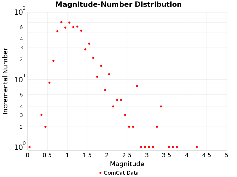 These plot shows the magnitude-number distribution of the aftershock sequence thus far. The left plot gives an incremental distribution (the count in each magnitude bin), and the right plot a cumulative distribution (the count in or above each magnitude bin).