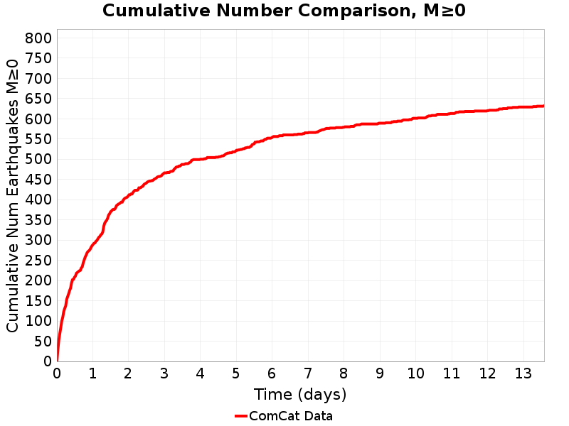 This plot shows the cumulative number of M≥0 aftershocks as a function of time since the mainshock.