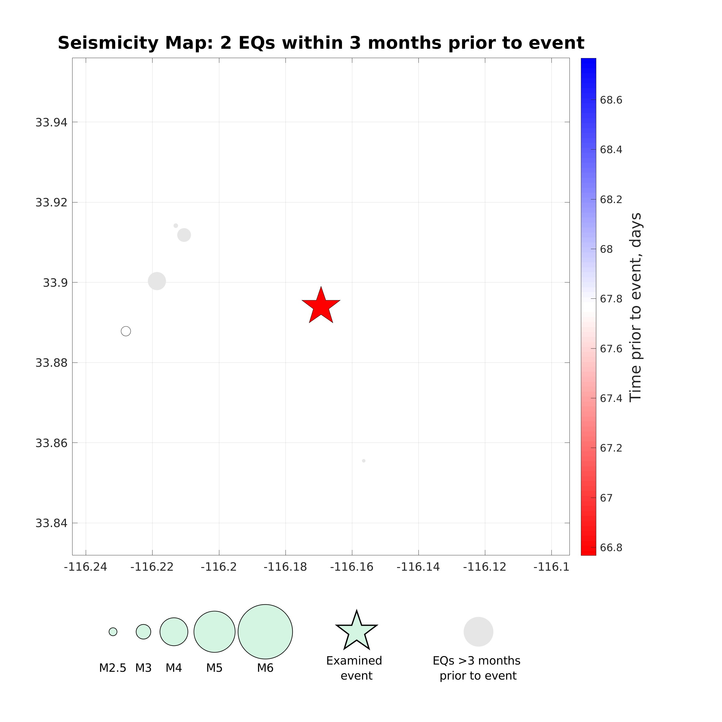 Map view of earthquakes (circles) with magnitude M2.0+ that occurred within 3 months and within 5 rupture lengths from the event considered (star). Circle size is proportional to magnitude (see legend) and color represents the time prior to the event considered (see colorbar).