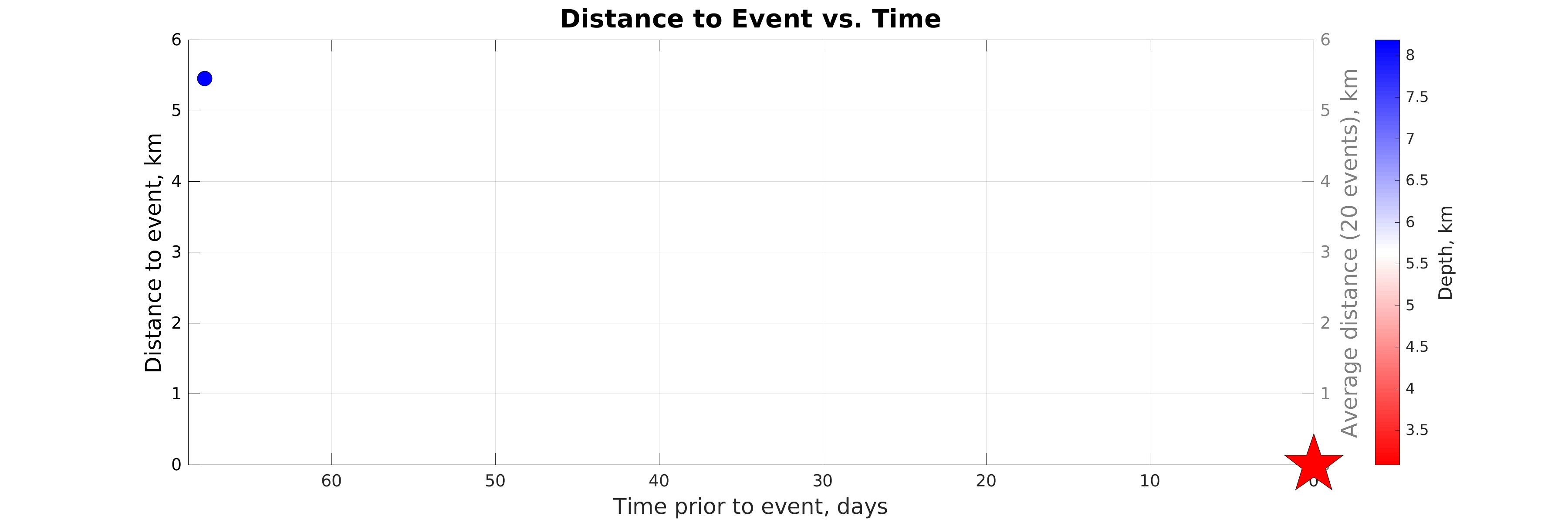 Distance (left axis) vs. time of earthquakes in the seismicity map prior to the event considered (star). Color represents hypocentral depth (see colorbar). The gray line shows distance to event considered averaged within sliding time window of 20 events.