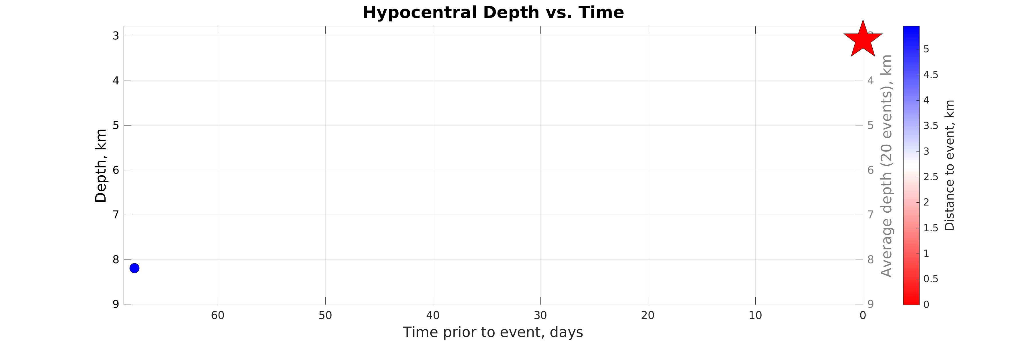Hypocentral depth (left axis) vs. time of earthquakes in the seismicity map prior to the event considered (star). Color represents distance to the event considered (see colorbar). The gray line shows the depth averaged within sliding time window of 20 events.