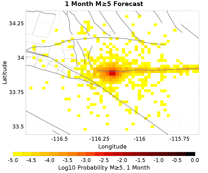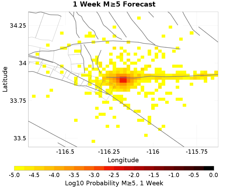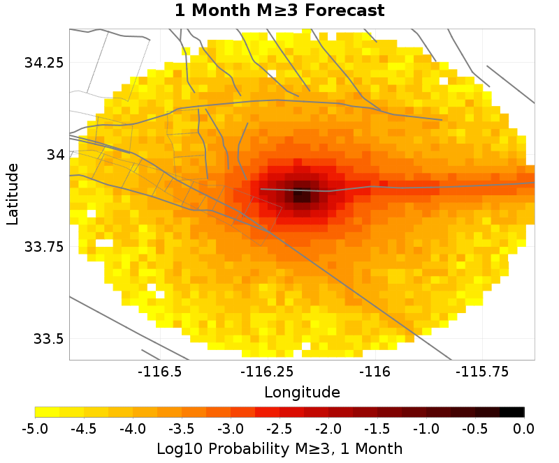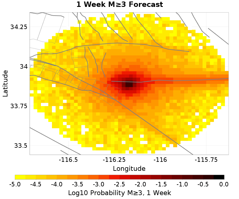 This section gives results from the UCERF3-ETAS short-term forecasting model. This model is described in Field et al. (2017), and computes probabilities of this sequence triggering subsequent aftershocks, including events on known faults.