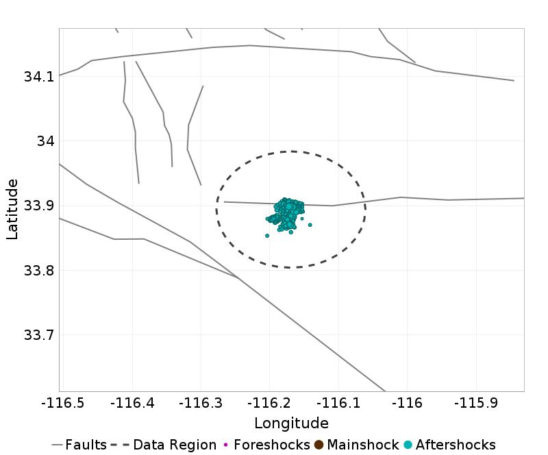 Map view of the aftershock sequence, plotted as cyan circles. The mainshock and foreshocks are plotted below in brown and magenta circles respectively, but may be obscured by aftershocks. Nearby UCERF3 fault traces are plotted in gray lines, and the region used to fetch aftershock data in a dashed dark gray line.