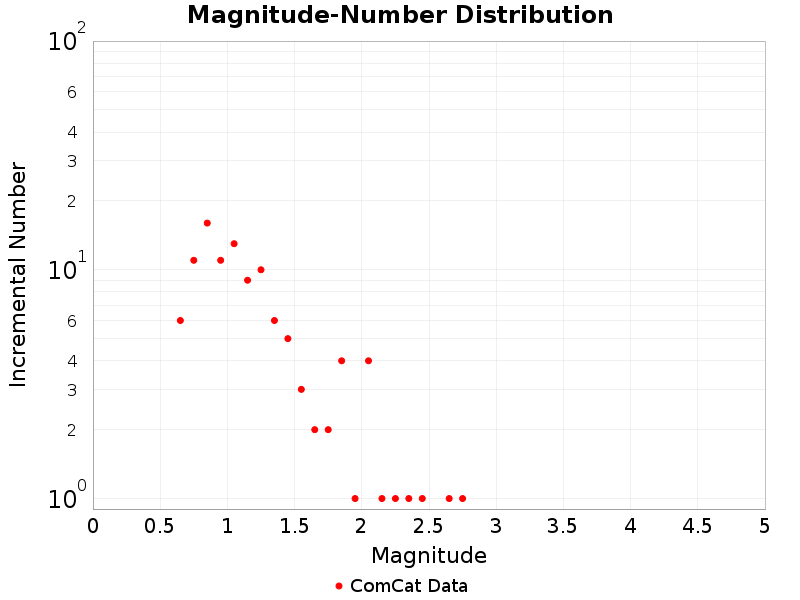 These plot shows the magnitude-number distribution of the aftershock sequence thus far. The left plot gives an incremental distribution (the count in each magnitude bin), and the right plot a cumulative distribution (the count in or above each magnitude bin).