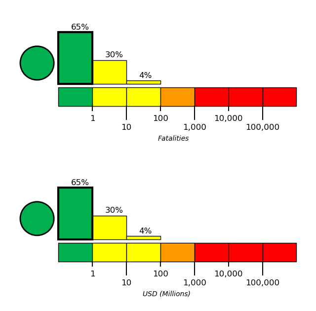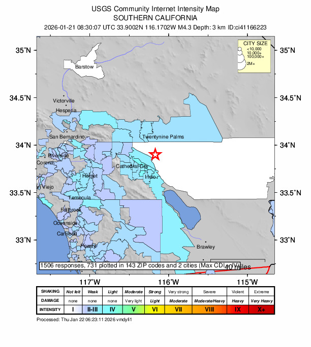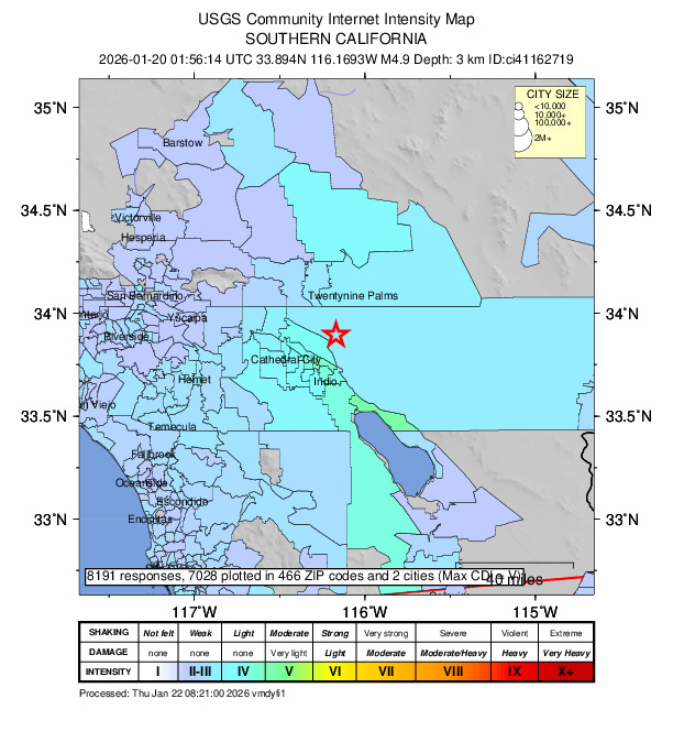 Probabilities are inherantly time-dependent. Those stated here are for time periods beginning the instant when this report was generated, 2026/01/22 02:49:46 CST. The model has not been updated with any observed aftershocks and may be out of date, especially if large aftershock have occurred subsequently or a significant amount of time has passed since the mainshock.