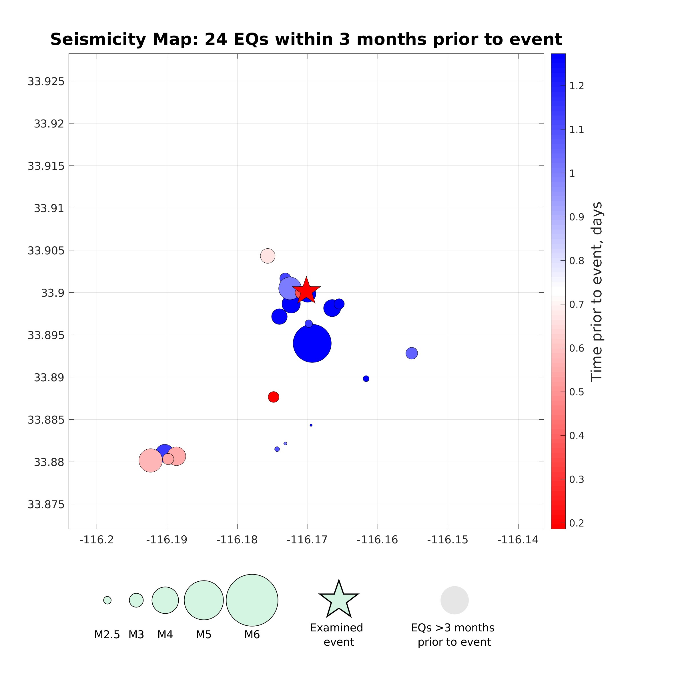 Map view of earthquakes (circles) with magnitude M2.0+ that occurred within 3 months and within 5 rupture lengths from the event considered (star). Circle size is proportional to magnitude (see legend) and color represents the time prior to the event considered (see colorbar).