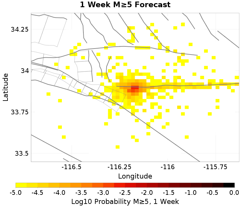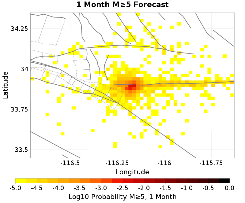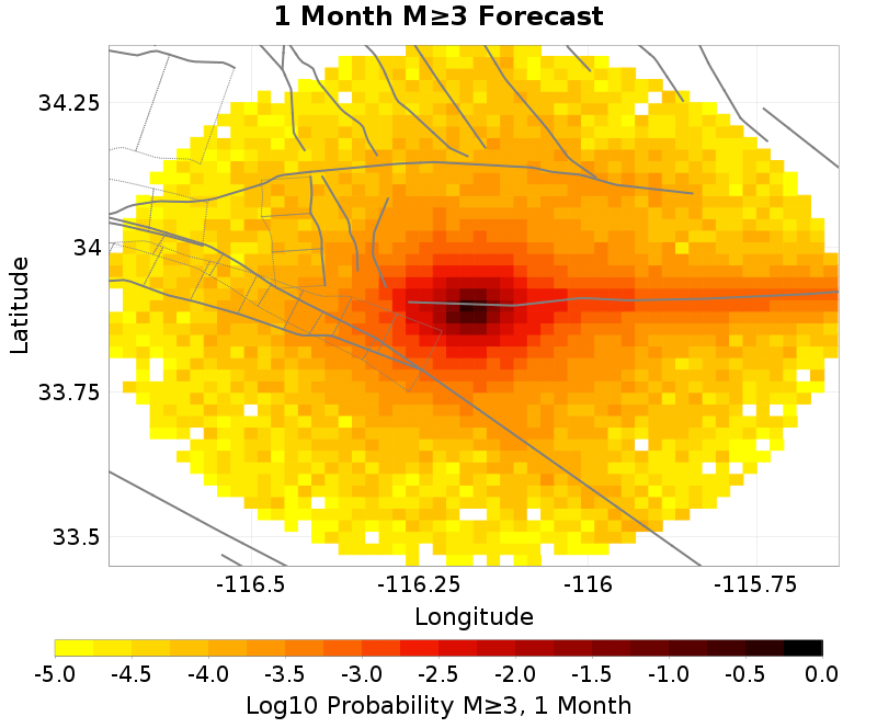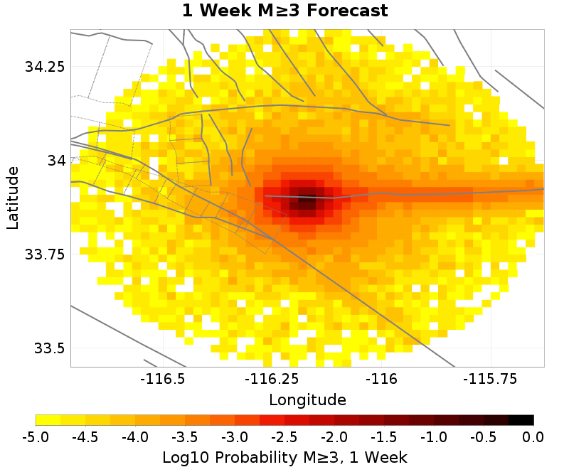This section gives results from the UCERF3-ETAS short-term forecasting model. This model is described in Field et al. (2017), and computes probabilities of this sequence triggering subsequent aftershocks, including events on known faults.