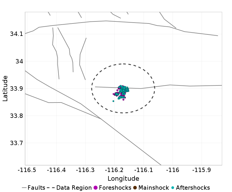 Map view of the aftershock sequence, plotted as cyan circles. The mainshock and foreshocks are plotted below in brown and magenta circles respectively, but may be obscured by aftershocks. Nearby UCERF3 fault traces are plotted in gray lines, and the region used to fetch aftershock data in a dashed dark gray line.