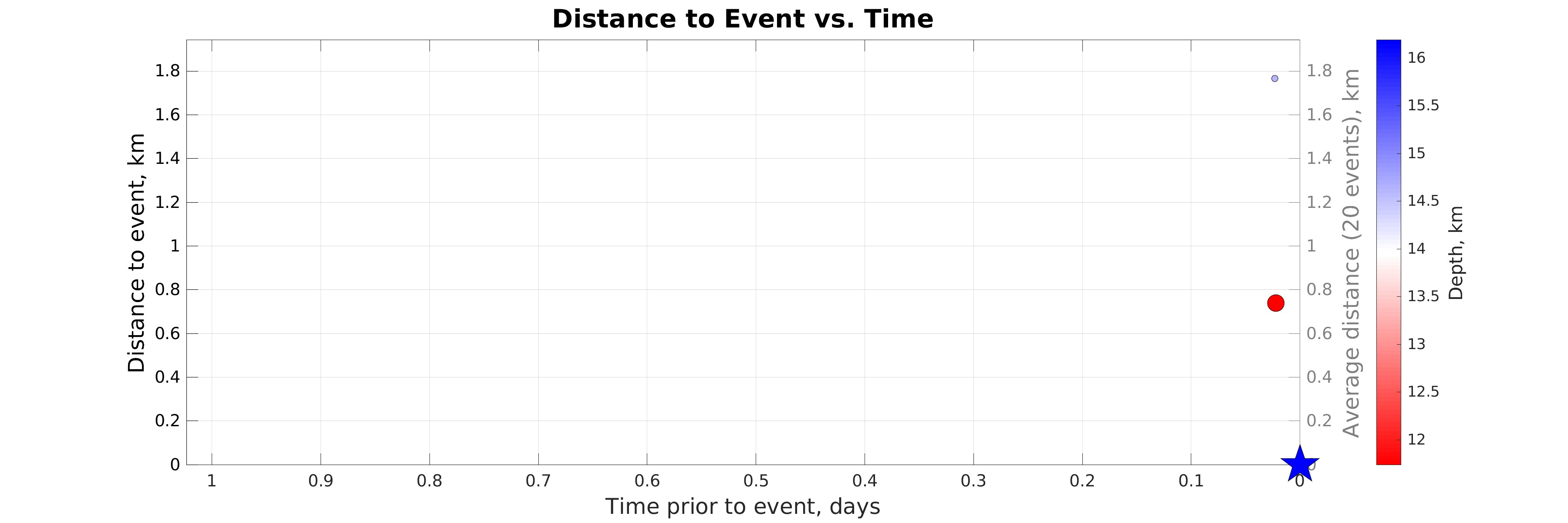 Distance (left axis) vs. time of earthquakes in the seismicity map prior to the event considered (star). Color represents hypocentral depth (see colorbar). The gray line shows distance to event considered averaged within sliding time window of 20 events.
