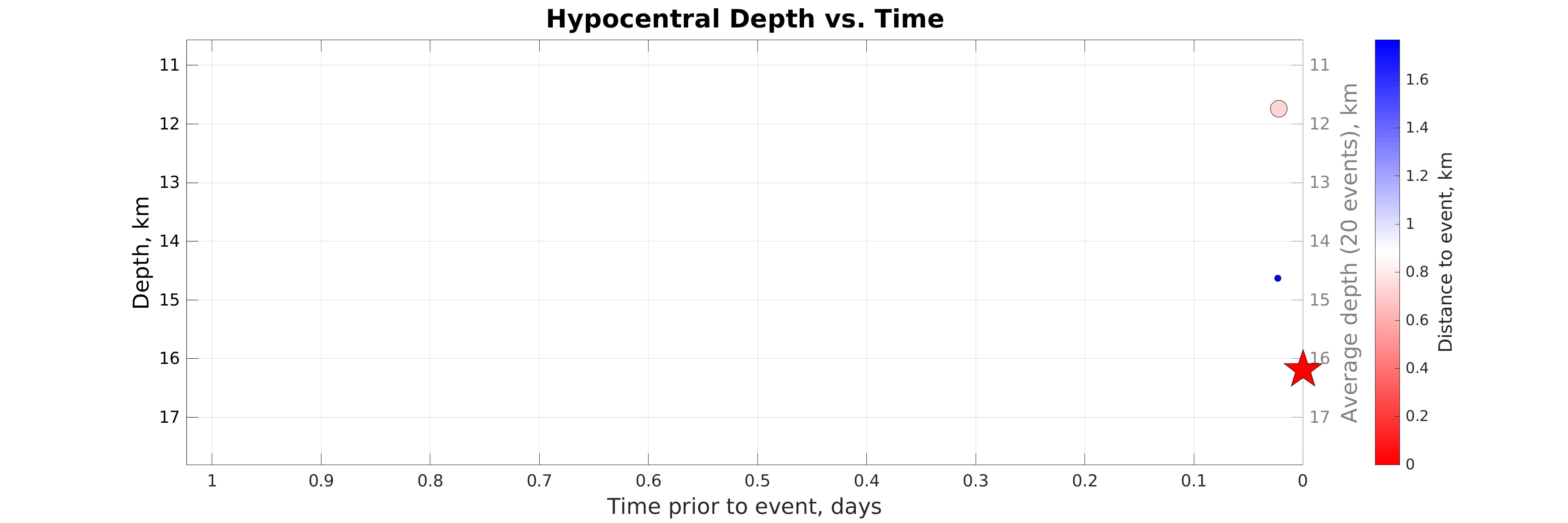 Hypocentral depth (left axis) vs. time of earthquakes in the seismicity map prior to the event considered (star). Color represents distance to the event considered (see colorbar). The gray line shows the depth averaged within sliding time window of 20 events.