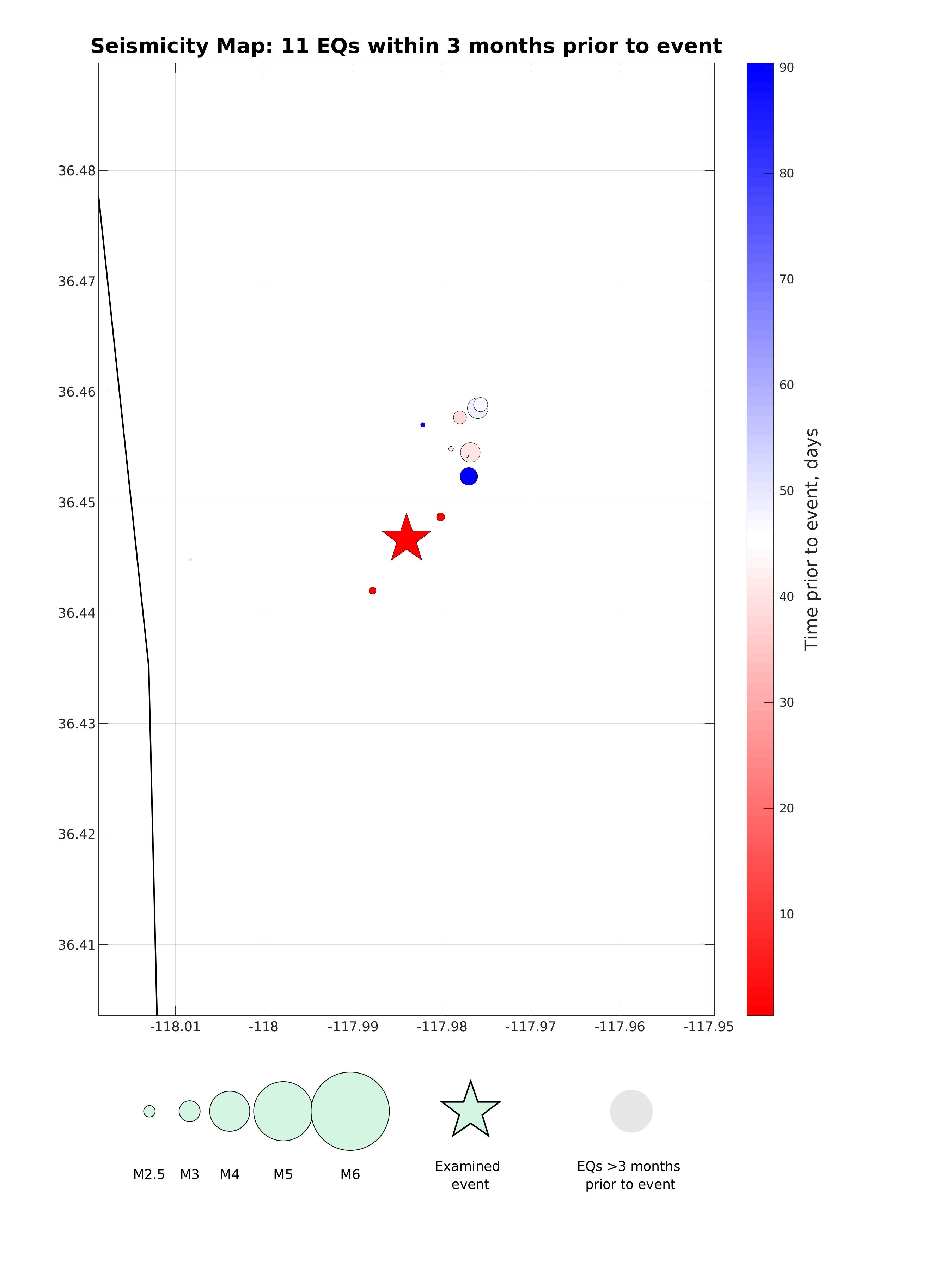 Map view of earthquakes (circles) with magnitude M2.0+ that occurred within 3 months and within 5 rupture lengths from the event considered (star). Circle size is proportional to magnitude (see legend) and color represents the time prior to the event considered (see colorbar).